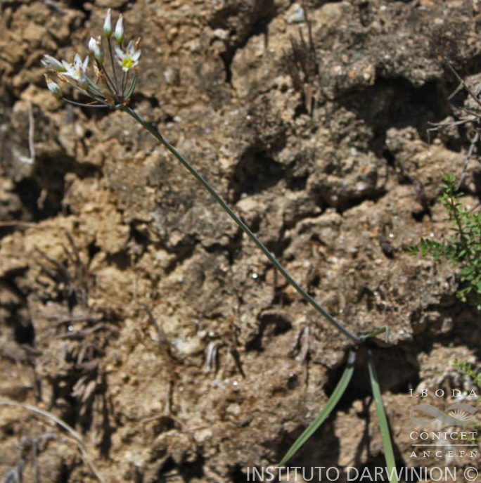 Hierba de 24-70 (120) cm de altura, bulbo sub-globoso de 12-23 mm de diám.; simple o con bulbillos, sin rizomas laterales. Vaina foliar de 4-7 cm long., eligulada; lámina foliar plana con surco medio abaxial marcado, borde liso o con escasas papilas, aguda, sub-erguida, verde-glauca, de 14-56 cm x 2-70 mm. Escapos 1-5, cilíndricos, erguidos, de 20-70 (117) cm de largo; umbela laxa 5-14-flora; brácteas triangular-acuminadas, de 1-3,2 cm concrescentes en la base; pedicelos subiguales de 1-7 cm, no sobrepasados por las bracteas. Perigonio sub-turbinado-patente, de 7,5-14 mm de largo, blanco crema, verdoso en la base, lineado-pardo violáceo; tépalos concrescentes formando un tubo de 1,6 a 4,6 mm de largo, con su porción libre ligeramente cuculada, oval o lanceolada, de 2-4 mm de ancho. Estambres connados, plano-lineares, bruscamente acuminados, de ápice ligeramente incurvo; erguidos y aproximados (aún a veces soldados) durante la antesis, rodeando por completo al gineceo, en su parte libre; anteras de 1,3-1,5 mm de largo. Óvulos 8-10 por lóculos; estilo de 3,1-6,5 mm de largo. Cápsula sub-globosa-turbinada, de 6-11 x 4-7,5 mm; semillas de 2-3 de diám., a veces con varios embriones. var. gracile.- Tépalos soldados en la base, los exteriores lanceolados, los interiores oblongos; anteras de 1,3 (1-1,6) mm. Ovario elipsoidal a obovoide, sésil.; estilo de 3,1 (2,8-3,6) mm. Las flores se abren al atardecer, cerrándose hacia la noche. Cromosomas: 2n =18, 19 (Nuñez et al., 1972; Souza et al., 2012).