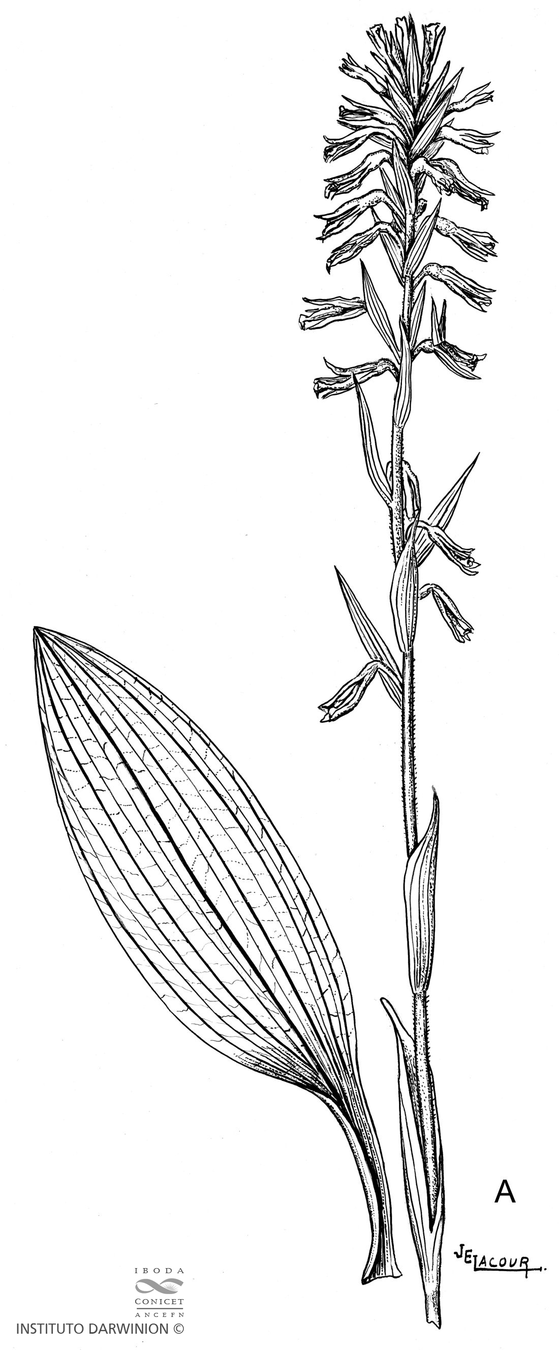 Herbácea de 20-60 cm alt., erecta. Hojas 8,5-13 × 1,5-3,5 cm, oblongo-elípticas a ovado-elípticas, seudopecíolo igual o poco más corto que la lámina, ensanchado en la base rodeando el tallo. Escapo glabro con 4-6 hojas caulinares, espaciadas, adpresas. Inflorescencia laxa, generalmente pluriflora, de flores poco vistosas, verdosas hasta pardo-rojizas, patentes a nutantes. Brácteas agudas más largas que el ovario. Sépalo dorsal 6-9 × 1-2,5 mm, acuminado, cóncavo en la base, los laterales 6-10 × 2-3 mm, obtusos, algo ensanchados en la base, 1-nervios. Pétalos linear-espatulados, 1-nervios, 1 mm de ancho y más cortos que el sépalo dorsal. Labelo 7-11 × 3-5 mm, en la base y en el ápice blanco, abruptamente contraído en la mitad superior, expandiéndose hacia el ápice en una lámina ancha transversalmente ovada, generalmente más ancha que la base, con borde finamente ondulado. Columna 3-4 mm de largo, cortamente pubescentes en la cara ventral; rostelo 0,3-0,4 mm de ancho.