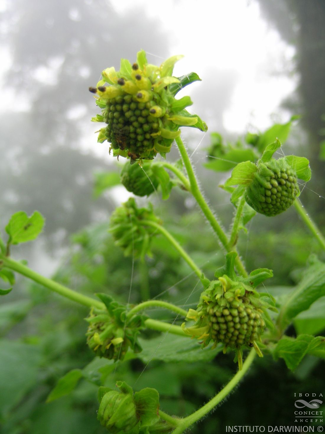 Hierbas perennes robustas, de 2-3 m de alto; tallos glanduloso-pubescentes. Hojas opuestas, pecioladas; pecíolos alados, con o sin aurícula nunca connada; láminas orbiculares a levemente ovadas, de 19,5-32,5 × 11-26,5 cm, ápice agudo, margen irregularmente dentado, glanduloso-pubescentes en ambas caras; hojas superiores ovadas, subsésiles o pecioladas. Capítulos generalmente más de 5, dispuestos en cimas corimbiformes o paniculiformes; pedúnculos de 0,3-4 cm de largo, glandulosopubescentes. Involucro acampanado a hemisférico, de 5,5-12 × 10-15 mm; filarios 3-seriados, los externos ovados u ovadolanceolados, de 5,5-12 × 3-7 mm, ápice agudo u obtuso, glabros, filarios internos ovado-lanceolados, de 5-11 × 2,5-4 mm, con ápice agudo, glanduloso-pubescentes, envolviendo parcialmente a los aquenios. Receptáculo con páleas ovadas de 2,5-6 × 1,3-1,5 mm, ápice obtuso. Flores del margen ca. 25, dispuestas en 2 series, con corolas amarillas, lígula oblonga, de 4-6 mm de largo, con tubo de 1,5-2 mm de largo; las del centro ca. 50, con corolas amarillas de 6- 8 mm de largo, tubo de 1,5 mm de largo. Aquenios obovoides, de 4- 5 × 3-4 mm, glabros. Papus ausente.
