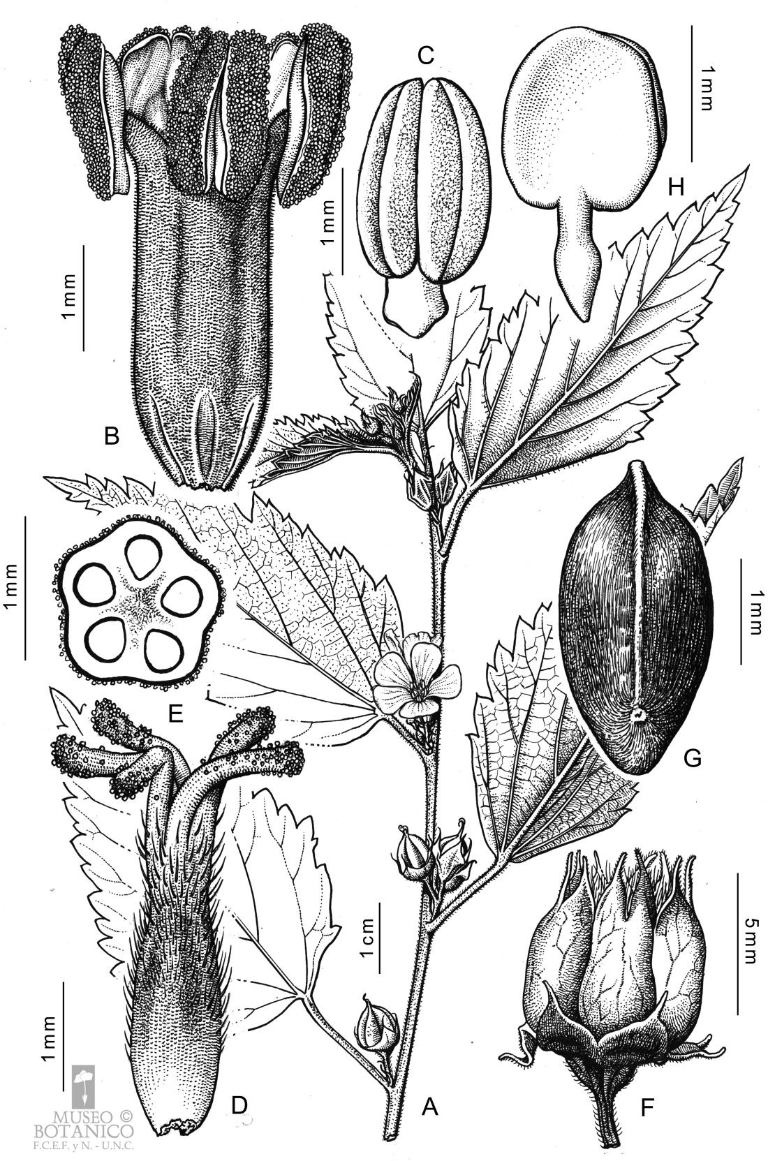 A. Rama florífera. B. Androceo. C. Estambre joven, vista dorsal. D. Gineceo. E. Transcorte por ovario. F. Fruto dehiscente. G. Semilla, vista hilar. H. Embrión (de A. T. Hunziker 16124, CORD).