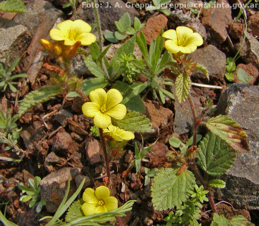 Subarbustos procumbentes, ramas de 20-40 cm de largo. Pecíolo de 5-7 (15) mm, lámina suborbicular u oval, hacia el ápice ovada u oblonga, obtusa, base redondeada, de ca. 2 (4,5) × 1,5 (3,5) cm, aserrada. Cimas axilares y terminales, paucifloras, últimas ramificaciones bifloras, pedicelos de 5-10 mm. Cáliz de 4-5 mm, setuloso, pelos capitados hacia el ápice, pétalos amarillos, de 8-11 × 3-5 mm, fl. longistilas: androceo de 4 mm, pistilo de 6 mm, fl. brevistilas: androceo de 7 mm, pistilo de 4 mm. Fruto esférico, de 4-5 mm, estipitado, loculicida, finalmente septicida, disgregándose a la madurez. Variedad que se diferencia por poseer tallos con setas dispersas y una fila de pelos cortos, raro pelos cortos en toda la superficie; hojas con ambas caras setulosas, a veces también pelos glandulares capitados y escasos pelos cortos simples.