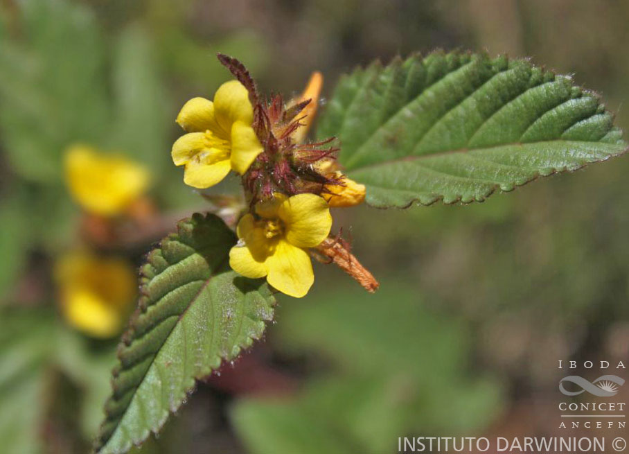 Subarbustos procumbentes, ramas de 20-40 cm de largo. Pecíolo de 5-7 (15) mm, lámina suborbicular u oval, hacia el ápice ovada u oblonga, obtusa, base redondeada, de ca. 2 (4,5) × 1,5 (3,5) cm, aserrada. Cimas axilares y terminales, paucifloras, últimas ramificaciones bifloras, pedicelos de 5-10 mm. Cáliz de 4-5 mm, setuloso, pelos capitados hacia el ápice, pétalos amarillos, de 8-11 × 3-5 mm, fl. longistilas: androceo de 4 mm, pistilo de 6 mm, fl. brevistilas: androceo de 7 mm, pistilo de 4 mm. Fruto esférico, de 4-5 mm, estipitado, loculicida, finalmente septicida, disgregándose a la madurez. Variedad que se diferencia por poseer tallos con setas dispersas y una fila de pelos cortos, raro pelos cortos en toda la superficie; hojas con ambas caras setulosas, a veces también pelos glandulares capitados y escasos pelos cortos simples.