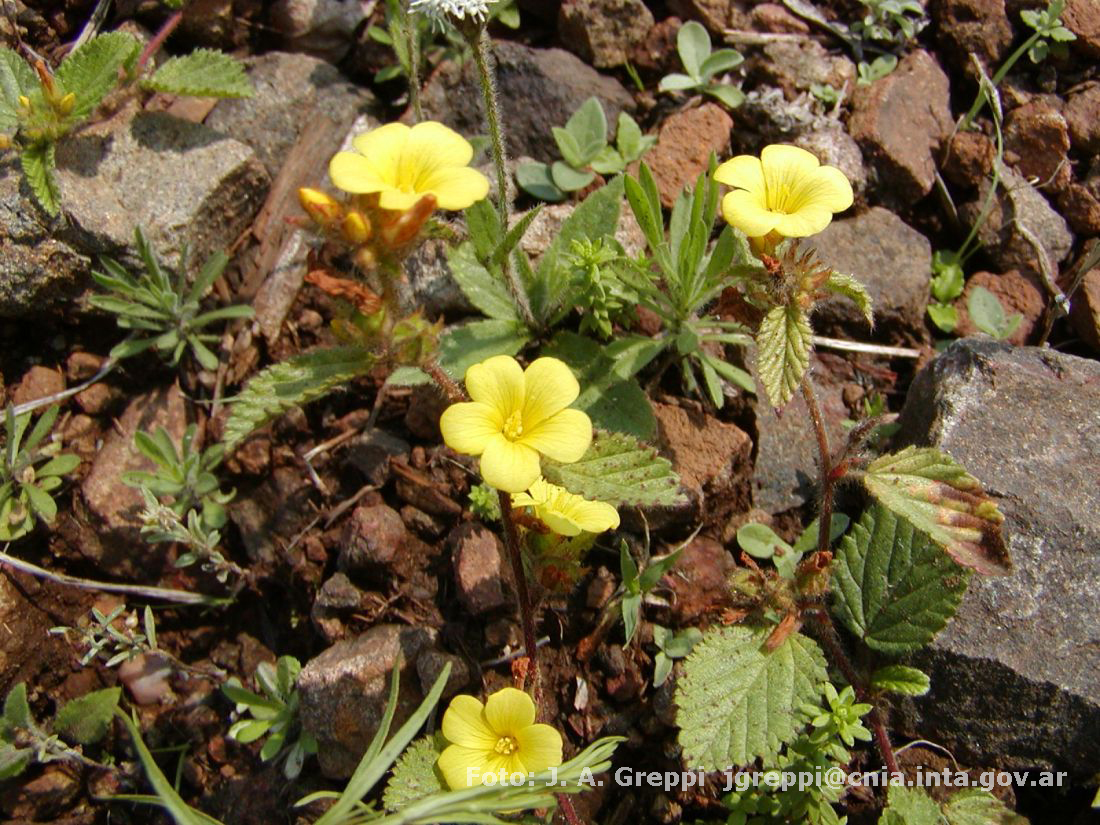 Subarbustos procumbentes, ramas de 20-40 cm de largo. Pecíolo de 5-7 (15) mm, lámina suborbicular u oval, hacia el ápice ovada u oblonga, obtusa, base redondeada, de ca. 2 (4,5) × 1,5 (3,5) cm, aserrada. Cimas axilares y terminales, paucifloras, últimas ramificaciones bifloras, pedicelos de 5-10 mm. Cáliz de 4-5 mm, setuloso, pelos capitados hacia el ápice, pétalos amarillos, de 8-11 × 3-5 mm, fl. longistilas: androceo de 4 mm, pistilo de 6 mm, fl. brevistilas: androceo de 7 mm, pistilo de 4 mm. Fruto esférico, de 4-5 mm, estipitado, loculicida, finalmente septicida, disgregándose a la madurez. Variedad que se diferencia por poseer tallos con setas dispersas y una fila de pelos cortos, raro pelos cortos en toda la superficie; hojas con ambas caras setulosas, a veces también pelos glandulares capitados y escasos pelos cortos simples.
