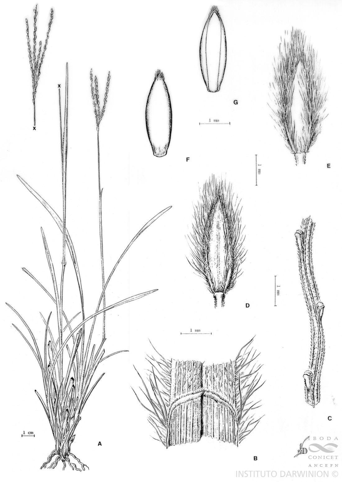 A. Planta. B. Región ligular. C. Porción de raquis de la inflorescencia. D. Espiguilla vista dorsal. E. Espiguilla vista ventral. F. Antecio superior vista dorsal. G. Antecio superior vista ventral.