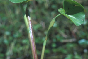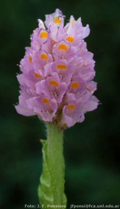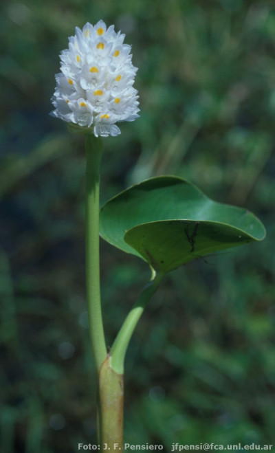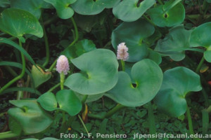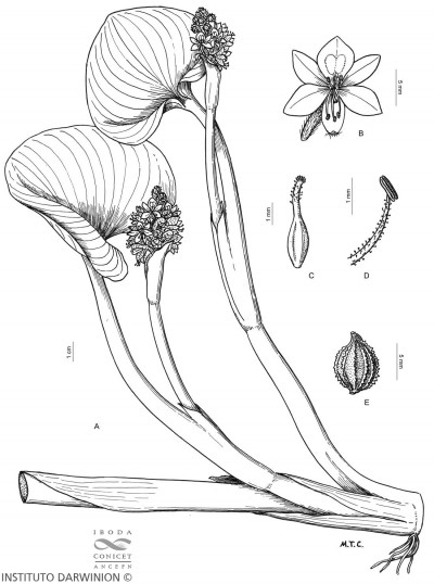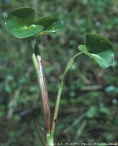 Plantas anuales o perennes, flotantes o semisumergidas. Tallos flotantes, horizontales, cilíndricos, hasta 3 m de largo, purpúreos. Hojas dísticas, pecioladas, pecíolo de 18-20(40) cm de largo, con la parte inferior algo ensanchada; lámina orbicular o reniforme, más ancha que larga, de 4-9(12) × 7-10(20) cm, truncadas a cordadas en la base; vaina basal membranácea, purpúrea, de 6-7 cm de largo, prolongada en una lígula hialina. Inflorescencia espiciforme, hasta con 40 flores, espata glabra, verdosa, 2-4 cm de largo, soldada en la mitad inferior a abierta hasta la base, acuminada, borde superior reflejo, raquis con la parte basal desprovista de flores, porción que queda cubierta por la espata. Flores liláceas o blancuzcas, 15-20 mm de largo. Perigonio corolino infundibuliforme, 2-labiado, tubo fuertemente surcado, rara vez fenestrado, lóbulos internos ovales u obovales, el mediano con una mancha amarilla, lóbulos externos lanceolados, el inferior más angosta; raquis y tubo perigonial con pelitos glandulares uniseriados. Estambres 6, 3 inferiores más largos y arqueados hacia arrriba, los otros 3 más breves incluídos en el tubo perigonial; anteras azuladas. Gineceo heterostilo, ovario fusiforme, glabro, estilo con pelos papilosos en la mitad superior. Angiocarpo pedunculado, alargado, 4 × 7 mm, con costillas espinulosas que le dan aspecto erizado, apiculado. Aquenio maduro sumergido. Semilla ovoide, lisa, castaño claro, 3-4 mm de largo.