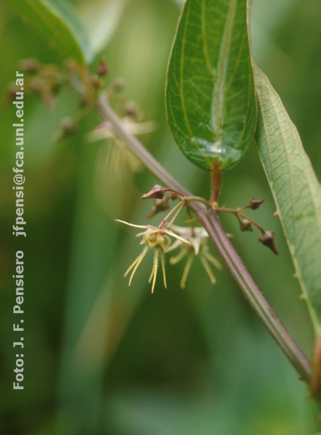 Arbustos apoyantes de 2-8 m de altura, con ramas y hojas dísticas, glabros o finamente pubescentes. Hojas enteras o con algún diente hacia el ápice, pecíolo de 0,5-1,5 cm, lámina oval, ovada o lanceolada, aguda, epifilo glabro o subglabro, hipofilo con las axilas de las venas barbadas o completamente pubescentes. Inflorescencias axilares, 5-8-floras. Flores erectas, tubo estaminal campanulado, membranáceo. Fruto de ca. 1 cm, cubierto de mamelones que rematan en una arista punzante, los mamelones de la línea media generalmente más grandes y con la arista más larga. Semilla lisa, de ca. 8 × 3 mm.