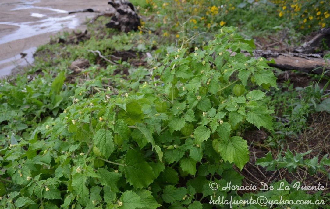 Hierbas anuales, de (8-)10-100 cm de alto; tallos glandulosopubescentes, pegajosos al tacto, con tricomas largos, hasta de 2 mm. Pecíolos de 1,5-7 cm, con tricomas simples, glandulares; láminas anchamente ovadas a subcirculares, de 3-10 × 2-6,5 cm, lobadas a dentadas con 2-8 dientes por lado, con tricomas eglandulares de 150-400 µm, otros tricomas glandulares breves (de 40-70 µm), de cabezuela pluricelular y otros más largos (de 150 a 700 µm) con cabezuela 1-celular. Pedicelo curvo de 4-10(-12) mm; cáliz de 2,5-5 mm, lóbulos de 1-3 mm, divididos hasta 1/2 -2/3 de la longitud del cáliz, con abundantes tricomas glandulares largos, a veces ramificados (cabezuela 1-celular) entremezclados con otros glandulares cortos (cabezuela pluricelular); corola de 6-10,5 × 4-14 mm, amarilla, con 5 manchas violeta oscuro o con máculas pardas poco contrastantes, con tricomas largos, eglandulares y glandulares ramificados, en el borde superior del tubo; estambres de 2,5-6 mm, anteras azules de 1,5-2,5 mm, filamentos con pelos glandulares, petalostemos pubescentes; gineceo de 4,5-6,5 mm, ovario de 1-1,5 mm, estilo y estigma de 3,5- 5 mm. Baya de 0,5-1 cm de diámetro; pedicelos fructíferos de 8-17 mm; cáliz fructífero de 1,5-3,5 × 1,5-2,8 cm, 5-costado, con tricomas glandulares y eglandulares largos.