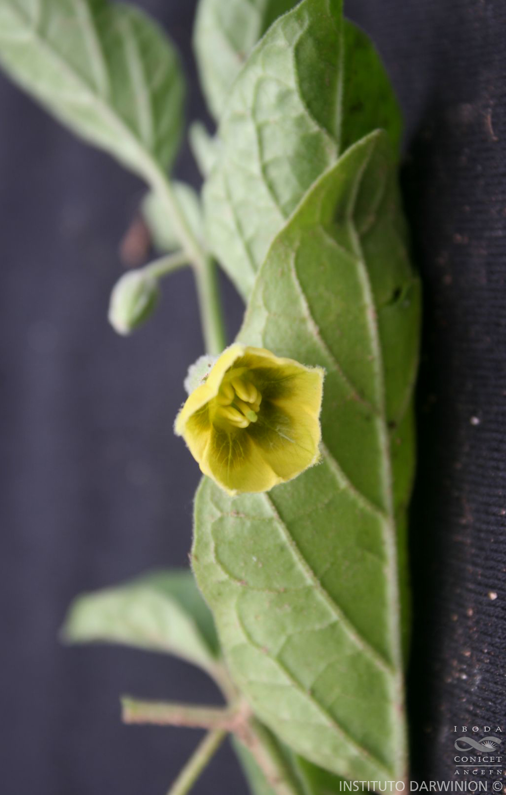 Hierbas perennes de 10-70 cm de alto, con raíces gemíferas; tallos ascendentes con tricomas simples, ramificados, glandulares, de 100 a 1200 µm. Pecíolos de 10-32 mm; láminas ovadas de 25-65 × 20-45 mm. Flores péndulas, pedicelos de (6-)9-20 mm; cáliz verde de 5-9 × 5-7 mm, lóbulos triangulares, de 2-4 mm; corola amarilla, rotáceo-acampanada, de 8-16 mm de diámetro, con 5 manchas verdoso-amarillentas en la garganta, internamente, por debajo de las manchas con abundantes tricomas ramificados y simples, blancos y lanosos, en la cara externa con tricomas eglandulares, glandulares y ramificados glandulares, abundantes a lo largo de los nervios de los lóbulos desde las manchas hacia el ápice; estambres de 6-10 mm, anteras amarillas de 2,5-3,8 mm, y filamentos de 3-6 mm; gineceo de 8-12 mm. Baya péndula, de 9-15 mm de diámetro, anaranjada, glabra, dulce; pedicelos fructíferos curvos, de 13-20 mm; cáliz fructífero de 18- 30 mm de largo × 12-20 mm de diámetro, 10-costado.