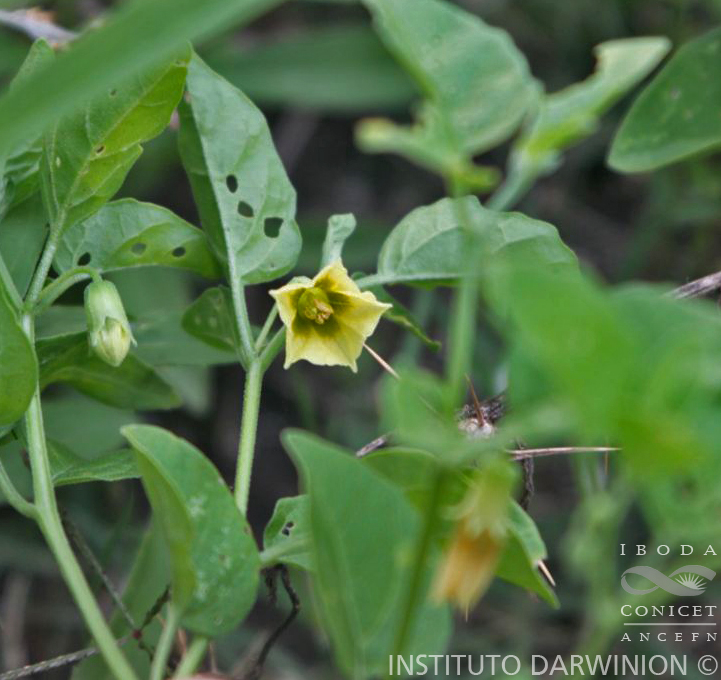 Hierbas perennes de 10-70 cm de alto, con raíces gemíferas; tallos ascendentes con tricomas simples, ramificados, glandulares, de 100 a 1200 µm. Pecíolos de 10-32 mm; láminas ovadas de 25-65 × 20-45 mm. Flores péndulas, pedicelos de (6-)9-20 mm; cáliz verde de 5-9 × 5-7 mm, lóbulos triangulares, de 2-4 mm; corola amarilla, rotáceo-acampanada, de 8-16 mm de diámetro, con 5 manchas verdoso-amarillentas en la garganta, internamente, por debajo de las manchas con abundantes tricomas ramificados y simples, blancos y lanosos, en la cara externa con tricomas eglandulares, glandulares y ramificados glandulares, abundantes a lo largo de los nervios de los lóbulos desde las manchas hacia el ápice; estambres de 6-10 mm, anteras amarillas de 2,5-3,8 mm, y filamentos de 3-6 mm; gineceo de 8-12 mm. Baya péndula, de 9-15 mm de diámetro, anaranjada, glabra, dulce; pedicelos fructíferos curvos, de 13-20 mm; cáliz fructífero de 18- 30 mm de largo × 12-20 mm de diámetro, 10-costado.