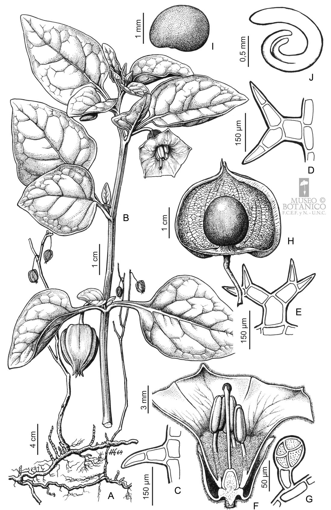 A. Sector basal de planta con frutos péndulos. B. Rama florífera. C. Tricoma eglandular de hoja. D-E: Tricomas eglandulares ramificados de hoja. F. Flor, corte longitudinal. G. Tricoma glandular del cáliz. H. Fruto y cáliz en corte longitudinal. I. Semilla. J. Embrión.