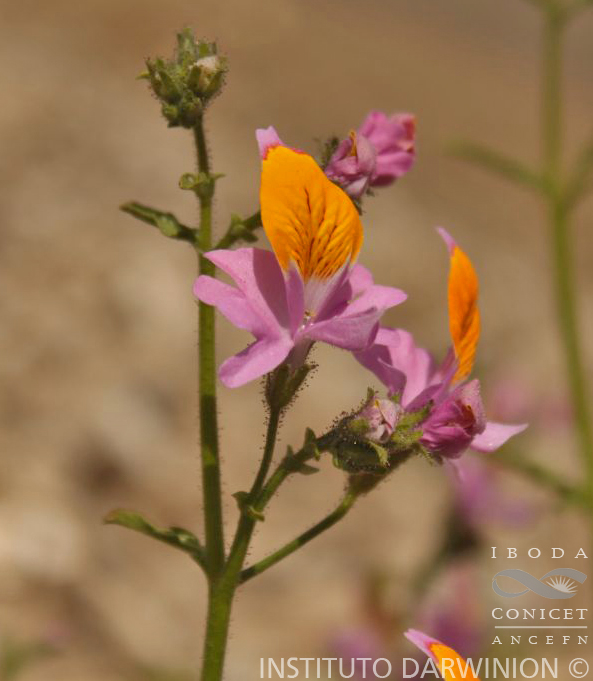 Hierbas anuales o bienales, de 30-55 cm de alto. Hojas hasta de 9 cm, pubescentes; cáliz de 6-8 mm; corola de 22-30 mm, rosado-lilacina, tubo breve, ca. 1,5 veces más largo que el cáliz (de 8-11 × 2-2,5 mm), limbo amplio, con un segmento anterior de 17-20 × 8-10 mm, ovado, atenuado hacia el ápice e internamente de color anaranjado, dos segmentos laterales, ca. 12 mm, 2-partidos, con las divisiones enteras o divididas y 2 segmentos posteriores soldados y divididos en 3 lóbulos (los laterales de 8 × 2 mm, enteros o 2-lobados y el central de 11-13 mm, obcordado, pubescente en la cara interna y rematando en dos lacinias algo encorvadas); ovario glabro, estilo corto de 9-11 mm, incluido.