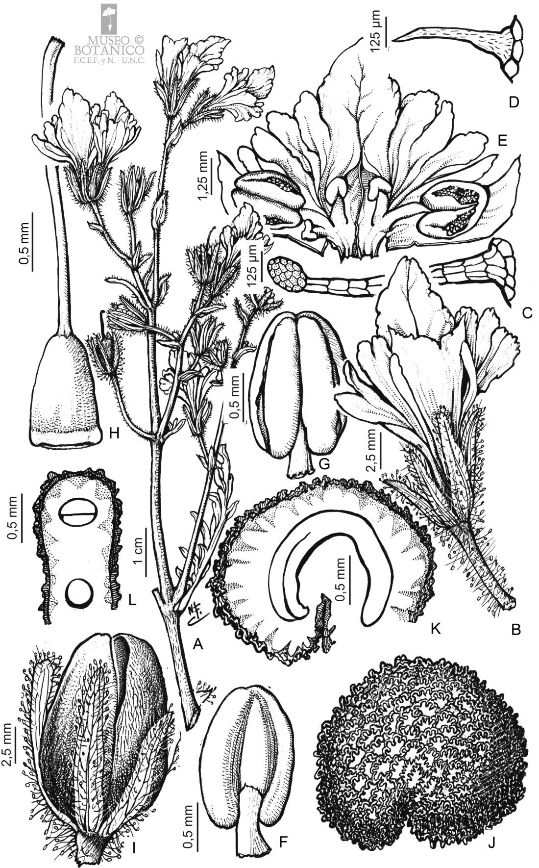 A. Rama florífera. B. Flor. C. Tricoma glandular del cáliz. D. Tricoma eglandular del cáliz. E. Sector de corola desplegada de botón floral. F. Estambre, vista dorsal. G. Estambre, vista ventral. H. Gineceo. I. Fruto. J. Semilla. K. Semilla, corte longitudinal. L. Sector de semilla, corte transversal.
