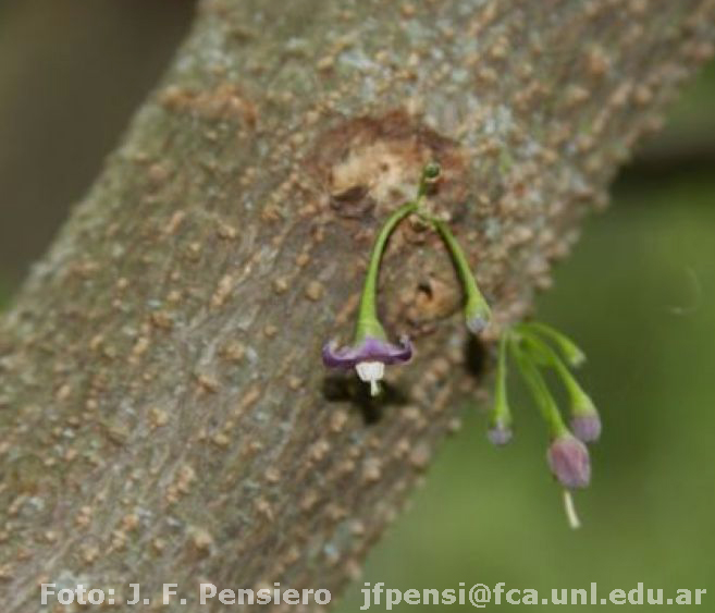 Arbustos o árboles espinosos, de (1,4-)2-4(-5) m de alto, espinas de 1-1,8 cm; indumento escaso o, con mayor frecuencia, con cantidad variable de tricomas simples, ramificados, sobre ramas jóvenes, pecíolos y láminas foliares (principalmente en el hipofilo). Pecíolos de 2-4 cm; láminas ovadas, de 8,5-10,5(-12) × 3,5-5,3 cm, de base atenuada y desigual y ápice agudo, epifilo glabro, hipofilo con tricomas eglandulares, simples y ramificados sobre la lámina y en mechones sobre todo en los nervios o en la intersección del nervio medio con los secundarios. Inflorescencias axilares, fasciculadas, 7-15-floras, sobre braquiblastos breves (de 3-5 mm). Flores péndulas; pedicelos de (1,5-)2-2,3(-2,8) cm; cáliz cupuliforme, de 2-2,3(-4) mm, que se desgarra tempranamente, verdoso, con 5 lóbulos muy breves, más anchos que largos; corola rotácea, de (4-)5,5-10(-13) mm, internamente lila con centro blanquecino y, a veces, también con nerviación blanquecina, la corola por fuera es blanquecina a lilacina; lóbulos más largos que anchos; filamentos blanquecinos o lilacinos, petalostemos con 2 aurículas totalmente soldadas a la corola, anteras de 1,5- 2,5 mm. Baya globoso-deprimida, de 7-9 mm de diámetro; pericarpo de color anaranjado a rojo intenso, con concreciones esclerosas; pedicelo fructífero péndulo, de (1,5-)2-2,3(-3,3) cm; semillas castaño oscuras, de 1,8-2 × ca. 1,1 mm.