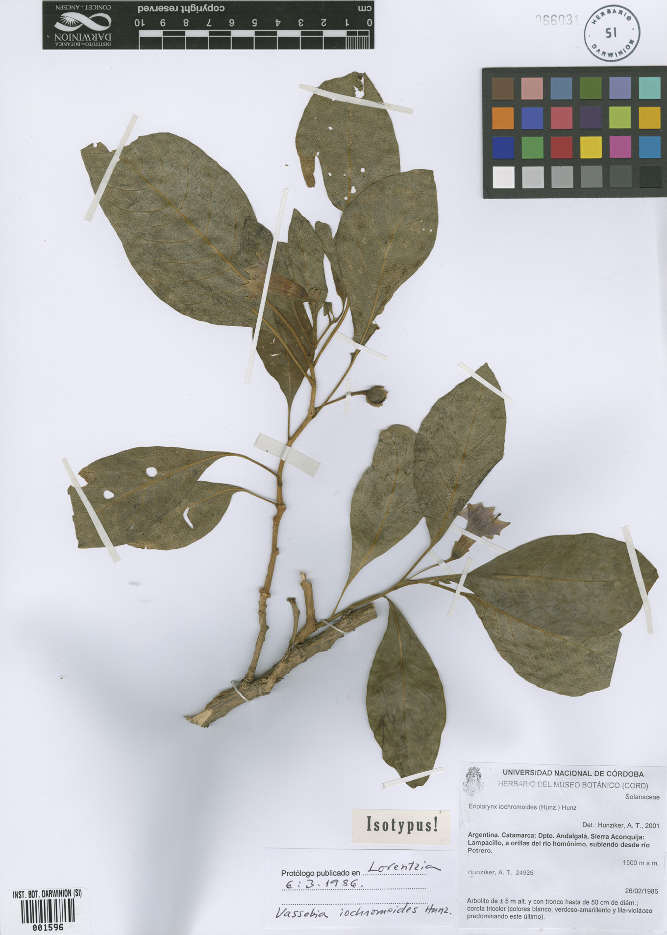 Árboles hasta de 5 m de alto, tronco principal ca. 0,5 m de diámetro. Pecíolos glabros de 1,5-3(-3,5) cm; láminas elípticas u ovadas, de 6,5-16 × 4-6,5 cm, base decurrente y ápice agudo, glabrescentes a pubérulas (tricomas escasos, diminutos). Inflorescencia por lo general 2-flora, a veces 1- ó 3- ó 4-flora. Flores péndulas, vistosas; pedicelos pubescentes, largos, de 2,3-2,8(-3,2) cm; cáliz campanulado, de 6-7 mm, con 5 apículos donde rematan sendas nervaduras longitudinales pubescentes; corola campanulada, violácea, de 26-28(-34) mm, tubo de 18-25 mm, entre 1,5 y 3 veces más largo que los lóbulos, éstos de 7-9,5 × 13-15 mm; por fuera con abundantes tricomas cortos, excepto en la base recubierta por el cáliz, por dentro con un anillo tricomatoso denso por encima de la inserción de los filamentos, en los tricomas ramificados algunas de sus ramas rematan en células globosas; filamentos de 16-17 mm, soldados a 2,5 mm de la base del tubo corolino, petalostemos bien notables, anteras de 4-4,5 mm. Baya esférica o subesférica, amarillenta, de 9-15 mm de diámetro, pericarpo grueso, con abundantes esclerosomas; pedicelos fructíferos encorvados o péndulos; cáliz acrescente hasta de 15 mm, envolviendo a la baya totalmente o en parte, con 4 ó 5 desgarramientos en su borde superior; semillas ca. 2,2 × 1,5 mm.