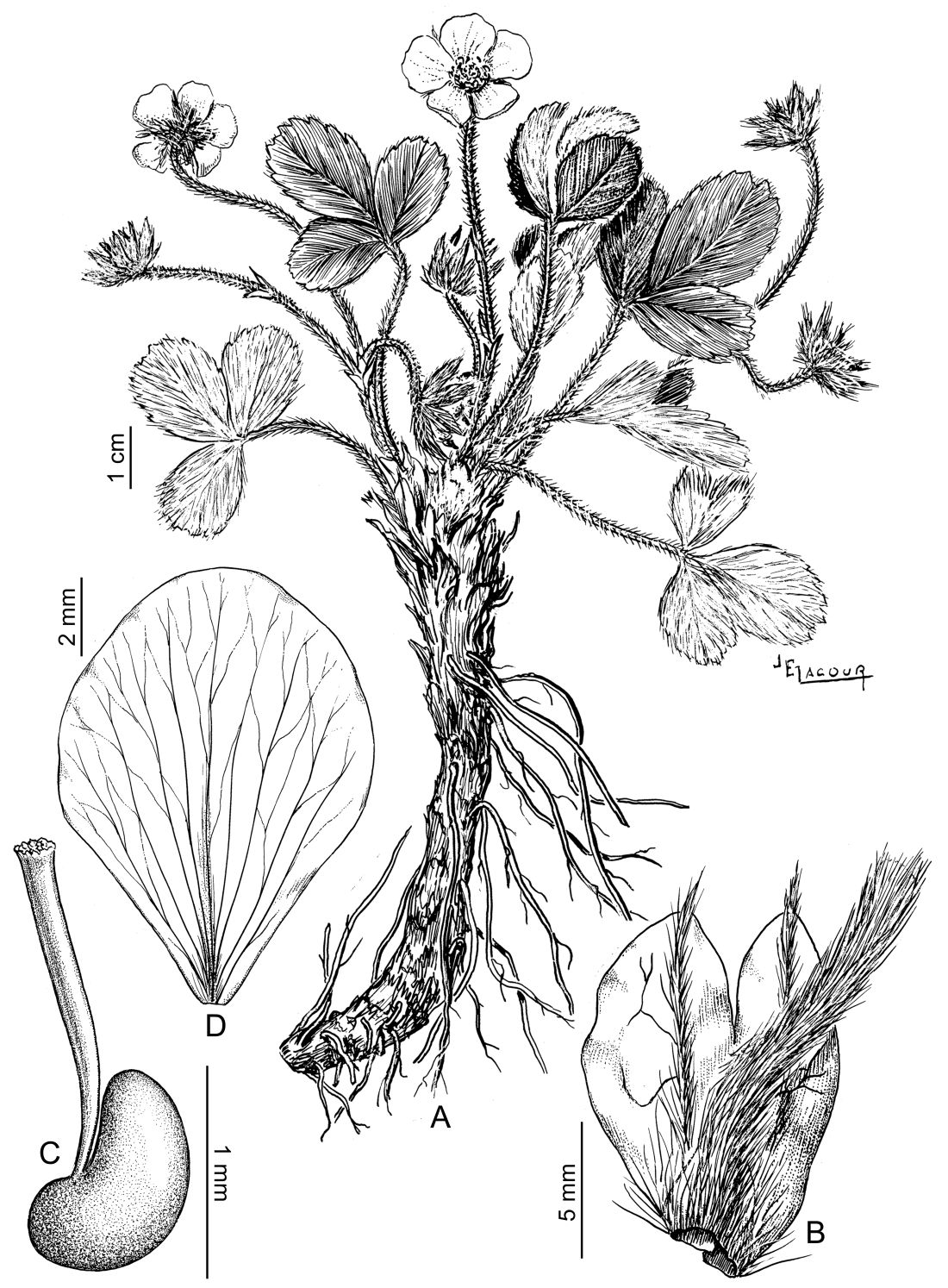 Observaciones: Nombres vernáculos y usos. “Frutilla silvestre”; “xilpu coronillo blanco”. Cantero et al. (2019) reportan su uso en la medicina popular; asimismo, refieren el consumo de los conocarpos como alimento. La frutilla cultivada moderna, Fragaria × ananassa (Weston) Duchesne ex Rozier, se originó en el siglo XVIII en Europa a partir de la hibridación entre la especie aquí tratada y F. virginiana Mill., una especie endémica de Norteamérica (Liston et al., 2014).