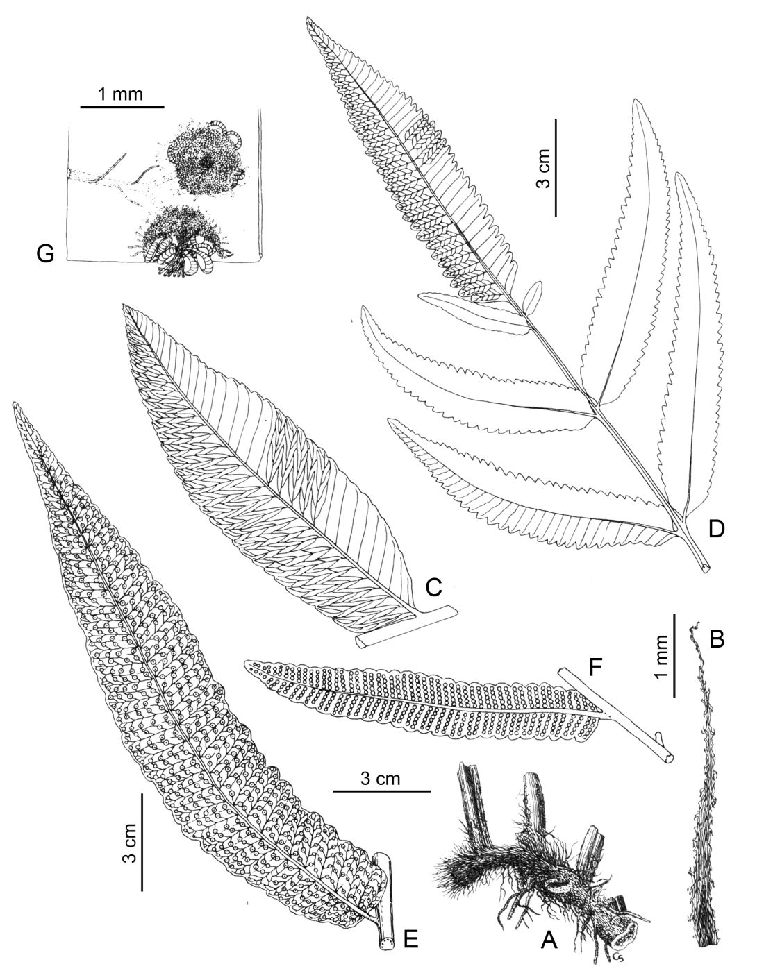 A. Porción del rizoma. B. Escama rizomática. C. Pinna estéril. D. Ápice de una fronde fértil. E-F. Pinna fértil. G. Soros mostrando indusios y esporangios.