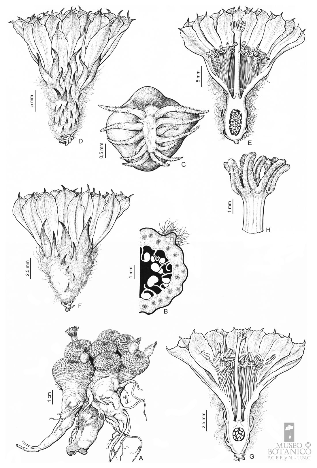 A. Planta. B. Transcorte de ovario de flor grande. C. Aréola. D y F. Vista lateral de 2 flores con notoria diferencia de tamaño. E y G. Cortes longitudinales de flor grande y chica respect. H. Estigma.
