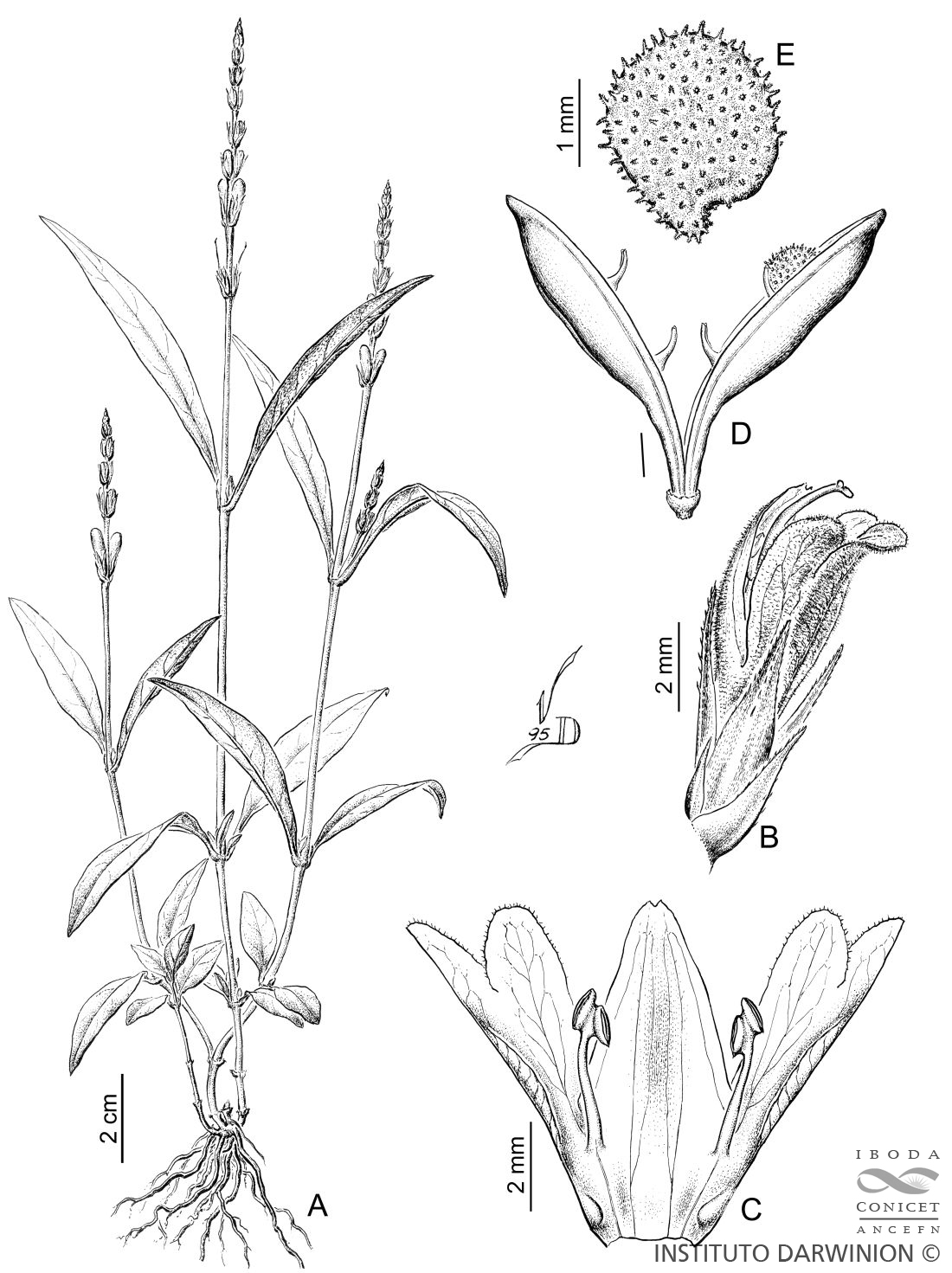 Hierbas pequeñas, con tallos ascendentes, radicantes en los nudos inferiores, hasta de 30 cm de alto y 1,5 mm de diámetro, glabros o pubérulos. Hojas subsésiles o cortamente pecioladas, lanceoladas o angostamente oblongas, de 3-6 × 0,4-1 cm, agudas en el ápice, cuneadas en la base, enteras, generalmente glabras. Flores en espigas terminales simples, de 3-8 cm de largo, con pedúnculos de 1,5-4 cm de largo y entrenudos de menos de 1 cm de largo; brácteas lanceoladas ca. 1,5 × 0,5 mm; bractéolas triangulares de 2-3 mm de largo, glabras o pubérulas; cáliz 4-partido con segmentos de 3-5 × 0,25 mm, acrescente; corola lilacina, ca. 1 cm de largo, con tubo ca. 5 mm de largo × 2,5 mm de diámetro en la fauce; labio posterior ovado, de 3 × 2 mm, obtuso y labio inferior de 3 mm de largo, 3-lobado, con los lóbulos ca. 2 × 2 mm, el del medio algo más ancho y con dibujo pectinado-rugoso, blanco, en la fauce; estambres exertos, inclusos debajo del labio posterior, con las anteras con las tecas superpuestas ca. 1 mm de largo, la inferior oblicua. Fruto una cápsula de contorno elíptico, ca. 0,7 mm de largo × 2 mm de grosor, glabra. Semillas 4, aplanadas, ca. 1 mm de diámetro, diminutamente verrucosas.