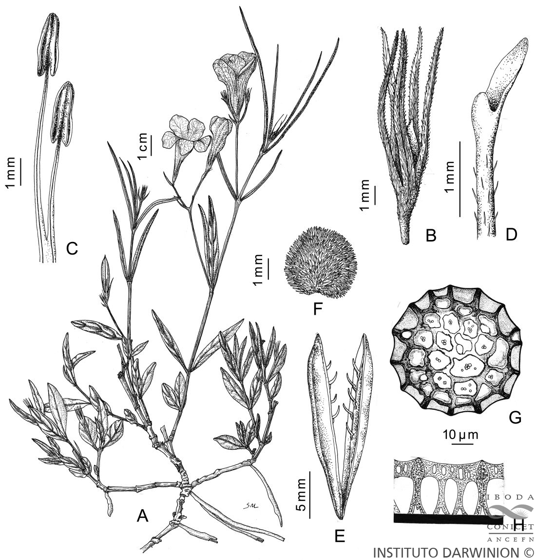 Hierba con rizoma basal radicante y tallos erectos, a veces geniculados y algo apoyantes, subtetrágonos, de 0,3-1,2 m de alto, glabros, con los nudos ciliados. Hojas opuestas, subsésiles o cortamente pecioladas; láminas ovadas o elípticas a angostamente oblongas o lanceoladas, verde-claras, de 5-12 × 0,3-1,5 cm, las basales más anchas y cortas que las apicales, todas obtusas en el ápice, cuneadas en la base, con el margen entero, a veces levemente ondulado, totalmente glabras, densamente glanduloso-punteadas en el envés. Flores dispuestas en dicasios multifloros laxos, largamente pedunculados en las axilas de las hojas; bractéolas lineales, pequeñas, agudas, foliáceas; cáliz de 0,7-1,5 cm de largo, con los segmentos lineales o lineal-lanceolados, agudos, exteriormente glanduloso-pubérulos e internamente adpreso- pubescentes; corola azul, blanca o violácea, de 3-4 cm de largo, con tubo basal de 0,5-1 cm de largo, garganta cilindro-obcónica de 1,5- 2 cm de largo; lóbulos suborbiculares ca. 1 cm de diámetro, patentes, el anterior con marcas hacia la fauce; estambres inclusos. Cápsulas de contorno oblongo, de 2-2,5 × 0,4 cm, huecas casi hasta la base, glabras. Semillas 16-24, de 2-3 mm de diámetro; retináculos de 2 mm de largo, agudos.