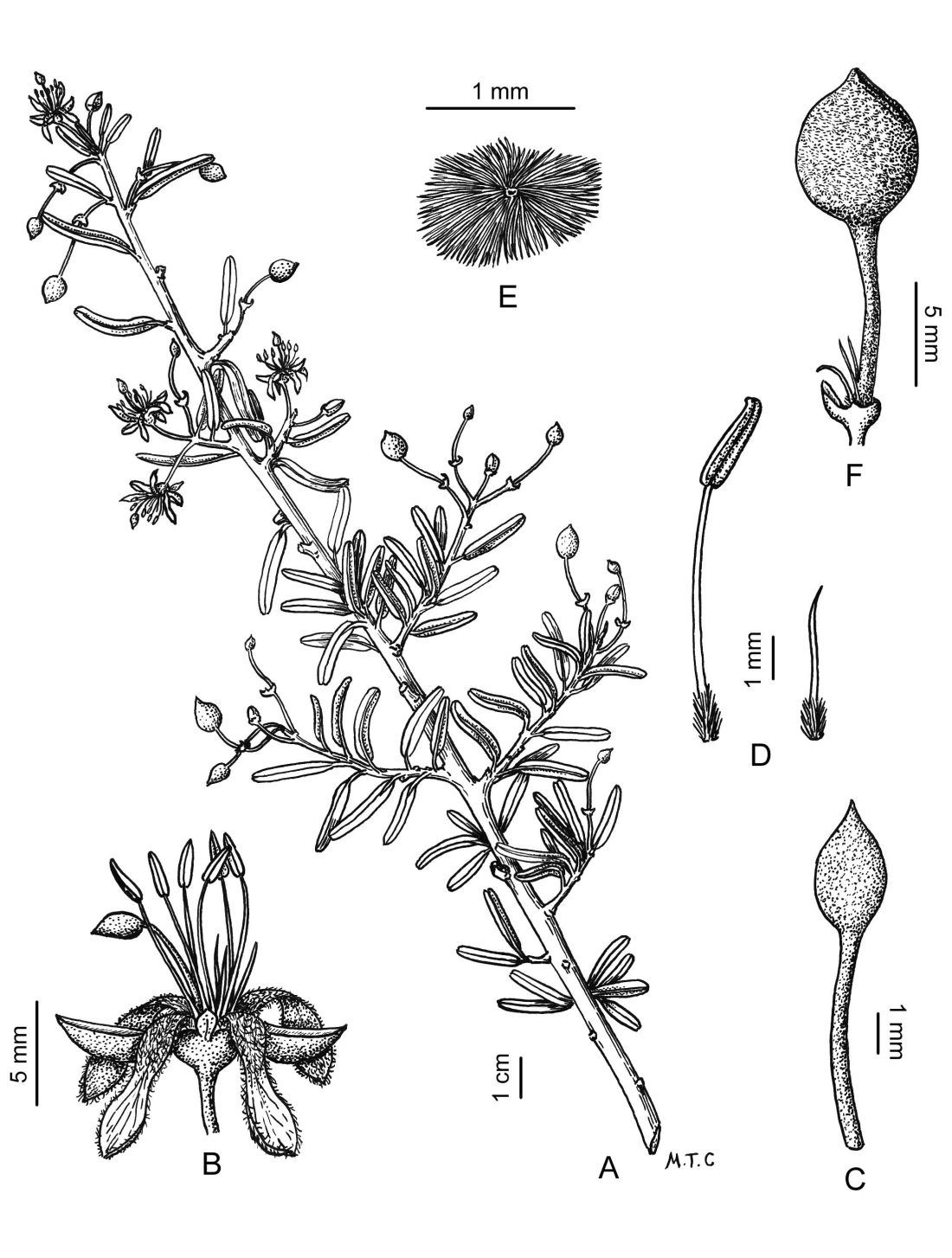 A. Rama florífera. B. Flor. C. Gineceo. D. Estambre y estaminodio. E. Tricoma estrellado. F. Fruto.