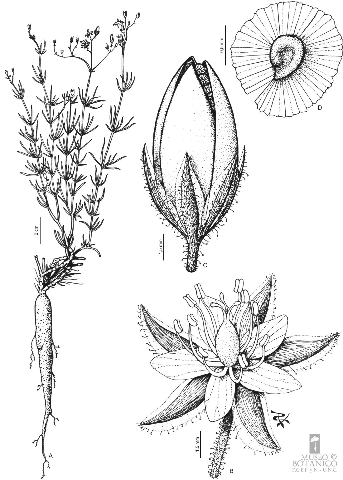 Spergula ramosa (Cambess.) D. Dietr. subsp. rossbachiae PedersenPedersen Fl. Patagónica, Colecc. Ci. Inst. Nac. Tecnol. Agropecu. 8(4a): 262. 1984 Pedersen (1984: 262) publica la subsp. rossbachiae, y afirma que se diferencia de la subespecie típica porque su raíz no es carnosa, la inflorescencia generalmente es menos ramificada y más densa, los pedicelos fructíferos son iguales o un poco más largos que el cáliz, las flores y cápsulas son mucho mayores, los estilos son más largos y las semillas generalmente no presentan papilas. En la descripción de S. ramosa publicada en la Flora de Entre Ríos (Pedersen, 1987: 277), queda de manifiesto que las características diagnósticas anteriormente mencionadas por el propio Pedersen (1984) en el protólogo de la subsp. rossbachiae, se solapan, ya que este autor observa que S. ramosa generalmente no presenta una raíz carnosa (…“raíz pivotante, gruesa, a veces carnosa”…) como también sucede para la subsp. rossbachiae; los sépalos van en el rango de 4-8 mm de largo vs. 4-9 mm de largo en la subsp. rossbachiae; los estilos van de 1-1,5 mm de largo, al igual que se observa en la subsp. rossbachiae; las cápsulas son hasta de 10 mm de largo, como ocurre en la subsp. rossbachiae; y por último que las semillas son lisas y generalmente sin papilas, de la misma manera que en la subsp. rossbachiae. Por último, cabe destacar que según la distribución brindada para S. ramosa en la Flora de Entre Ríos (Pedersen, 1987), la especie llega hasta la Patagonia central, por lo que también se solapa con la distribución conocida para la subsp. rossbachiae.