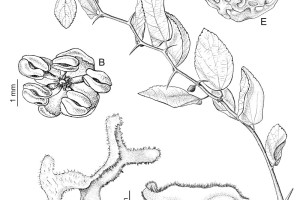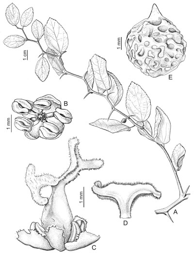 Arbusto o arbolito escandente, hasta de 7 m de alto; corteza lisa, grisácea; ramificación en zigzag, espinosa; espinas estipulares de (3-)5-15(-20) mm de largo, solitarias, a veces geminadas, semicurvas o curvas, a veces rectas, grisáceas, generalmente glabras, a veces subglabras con tricomas blanquecinos. Hojas con pecíolo de 3-4 mm de largo, subglabro o piloso con tricomas blanco -marfi l; láminas ovadas u oval-lanceoladas, de 2-4,5 × 1,5-2,5 cm, ápice cuspidado, los márgenes aserrados desde el tercio medio hasta el ápice o restringidos al tercio superior, en su mayoría con más de 6 dientes por semilámina, base obtusa; cartáceas en seco, concoloras; cara adaxial verde-clara u opaca, lustrosa en seco, lisa al tacto, subglabra con tricomas blanquecinos concentrados en las nervaduras; cara abaxial lisa al tacto, subglabra, con nervaduras prominentes beige o castañas, contrastando con la superficie laminar; domacios conspicuos, subglabros, ciliados, tricomas blancos concentrados en el margen del domacio. Inflorescencias axilares, contraídas en fascículos cimosos. Flores estaminadas subglabras o pilosas con tricomas blancos. Flores perfectas con ovario subglabro con tricomas blanquecinos; estilo conspicuo, ramas estigmáticas sésiles a pediceladas y 2-fi das. Fruto una drupa de 8,4-10 × 8,4-10 mm, anaranjada; epicarpo glabro; mesocarpo homogéneo, no ornamentado; pireno ovoide, mediano, de 4,5-6 × 4-4,5 mm, blanco, con un apículo de 0,1-0,3 mm de largo, ornamento verrugoso.