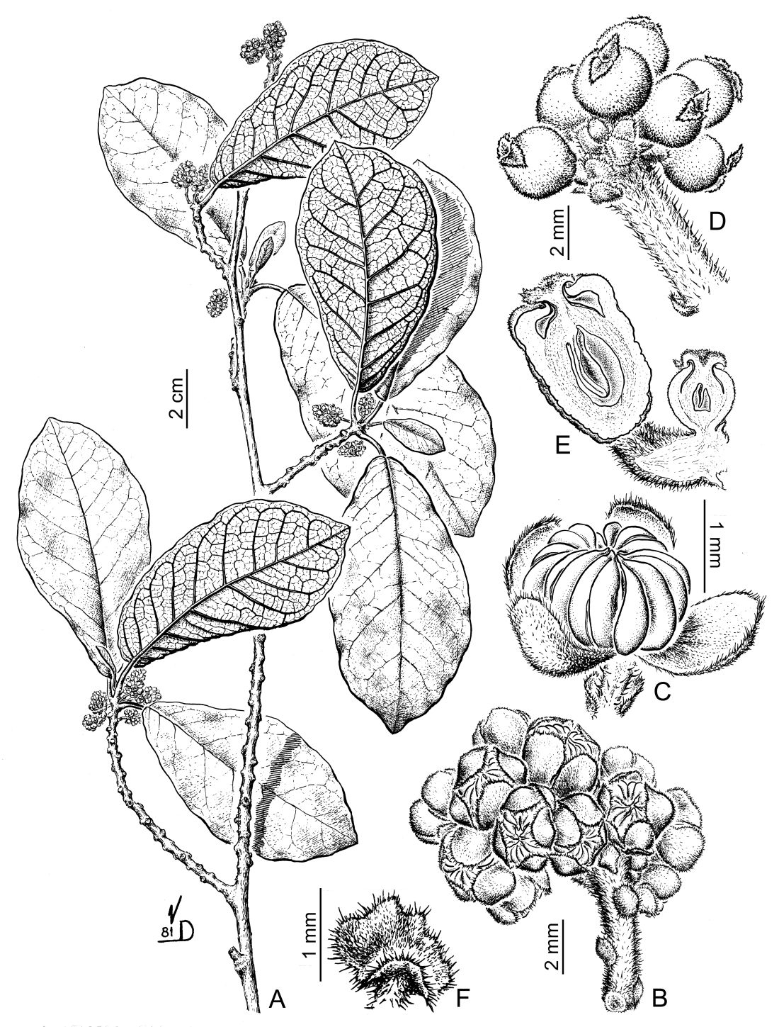 Árboles o arbustos de 6-12 m de alto; ramas densamente hispídulas a glabrescentes. Hojas con pecíolo de 4-8 mm de largo, densamente hispídulo; láminas ovadas a obovado-oblongas, de 4-11 × 1,5-5,5 cm, subcoriáceas, caducas, base redondeada a subtruncada, ápice acuminado a obtuso, redondeado, margen entero, a veces involuto y raramente dentado, vena media prominente, glabras, lustrosas en la cara adaxial y densa a moderadamente hispídulas en la abaxial; estípulas de 3-4 mm de largo, caducas. Inflorescencias estaminadas en espigas hasta subcapitadas, de 0,5-2,5 cm de largo, geminadas o solitarias, axilares; pedúnculos de 1-6 mm de largo, densamente estrigosos; brácteas suborbiculares. Flores estaminadas sésiles o con pedicelos hasta de 1 mm de largo; tépalos ovados, de 1,5-3 mm de largo; estambres con filamentos de 0,1-0,3 mm de largo, anteras de 1-1,5 mm de largo. Inflorescencias pistiladas en espigas hasta subcapitadas, de 0,6-1,6 cm de largo; pedúnculo de 2-15 mm de largo, puberulento; brácteas suborbiculares, de 0,6-1,4 mm de diámetro, peltadas. Flores pistiladas 5-10, sésiles a cortamente pediceladas; tubo del perianto 4-lobado en el ápice, pubérulo; ovario libre dentro del perianto, estigmas linguiformes, de 1,2-2 mm de largo. Fruto elipsoide hasta ovoide, de 1 cm de diámetro, liso, glabro, tornándose negro a la madurez. Semillas esferoidales de 4-5 mm de ancho.