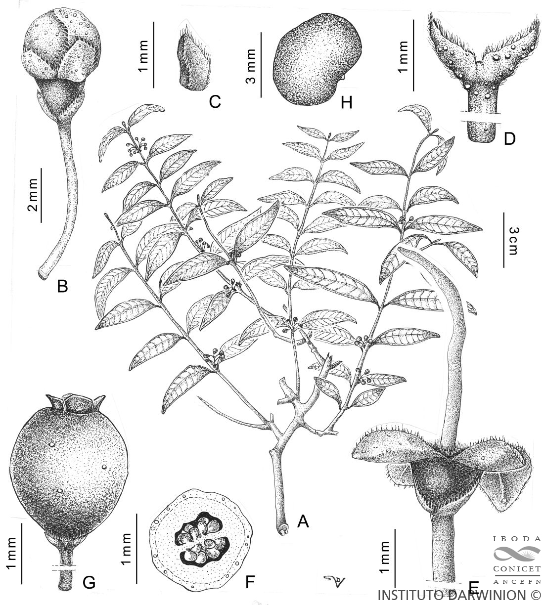 Arbusto de 2-3 m. Hojas de 3-5,8 x 1-1,8 cm, angostamente elípticas, glabras. Flores 3-9, en racimos congestos; hipanto glabro; sépalos glabros; pétalos glabros; estambres de 3,5-4,5 mm; disco estaminal piloso; estilo de 4-5 (7) mm. Fruto de 4-8 mm, subgloboso, comestible.