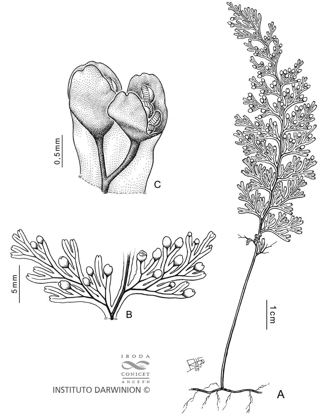 A. Planta. B. Detalle de pinnas fértiles. C. Detalle de los indusios.