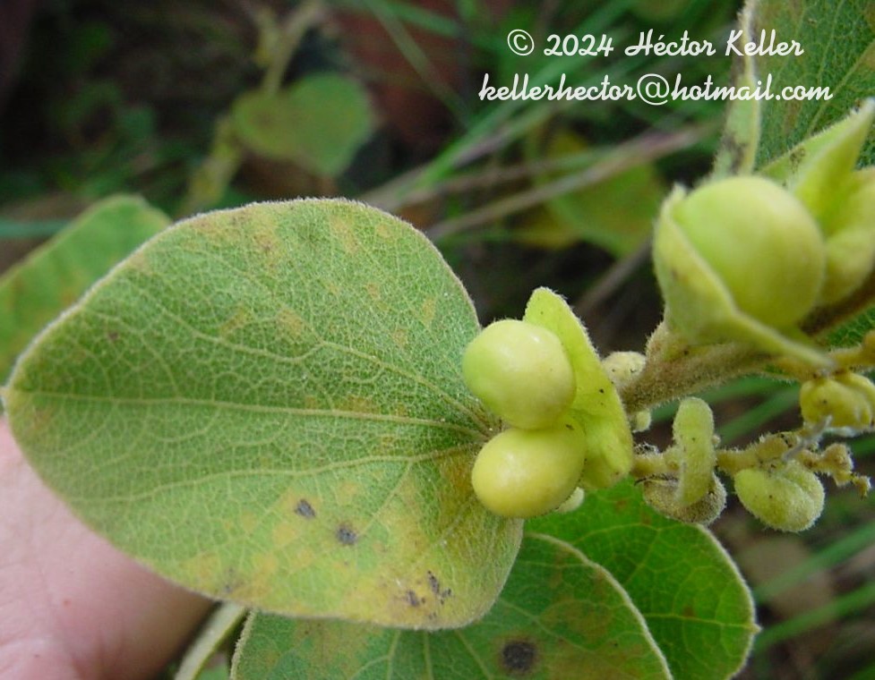 Sufrútice erecto, con xilopodio irregularmente contraído, dioico; tallos pubescentes, hasta de 90 cm de alto. Hojas anchamente ovadas a suborbiculares, de 3,5-8(-10) × 3-8 cm, papiráceas, pubescentes, discoloras; base truncada, redondeada o cordada; ápice obtuso o subagudo, mucronado; margen entero, con venación actinódroma; pecíolos pubescentes, robustos, de 0,2-2(-4) cm de largo. Inflorescencias axilares, hasta de 4 cm de largo; brácteas de las inflorescencias pistiladas foliáceas, pubescentes, con margen recurvo. Flores estaminadas con 4(-6) sépalos; corola gamopétala, levemente campanulada; sinandro con 3-4 anteras. Flores pistiladas con 1 sépalo, 1 pétalo y 1 ovario; estigma 3-lobado. Fruto una drupa subelipsoide, hasta de 1 cm de diámetro, pilosa, roja a la madurez. Semilla 1, pirenos costado-verrucosos.