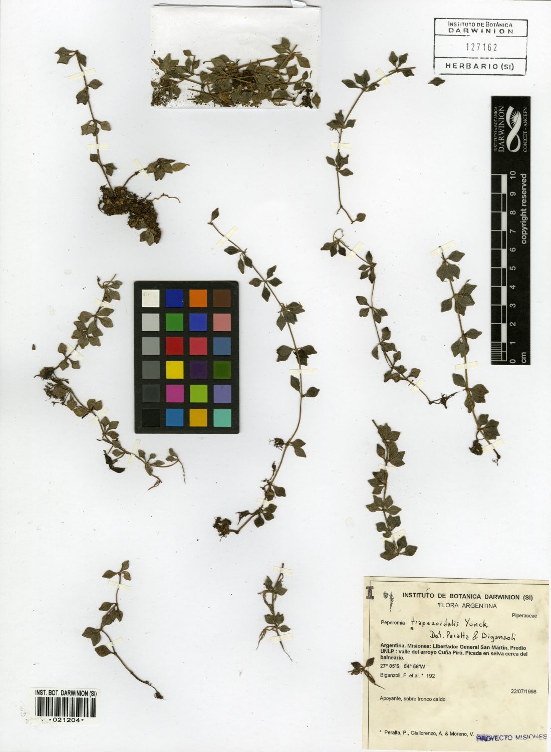 Hierbas epífitas, erectas; tallos radicantes en los nudos inferiores, entrenudos de 1-2 cm de largo, glabros a crespopuberulentos. Hojas dispuestas en verticilos de 2-4, con pecíolos de 1-8 mm de largo; láminas rómbicas, de 5-9 × 4-6 mm, base aguda, ápice agudo, obtuso a redondeado, cartáceas, palmati-3-nervadas, glabras a puberulentas en el envés. Inflorescencias solitarias y terminales, espigas densifloras, de 1-3 cm de largo; pedúnculos de 2-2,5 cm de largo; brácteas florales orbiculares. Frutos ovoideoelipsoideos, de 0,5-1 mm de largo, sésiles, de superficie lisa, inmersos en el raquis, con pseudocúpula, estigma apical.