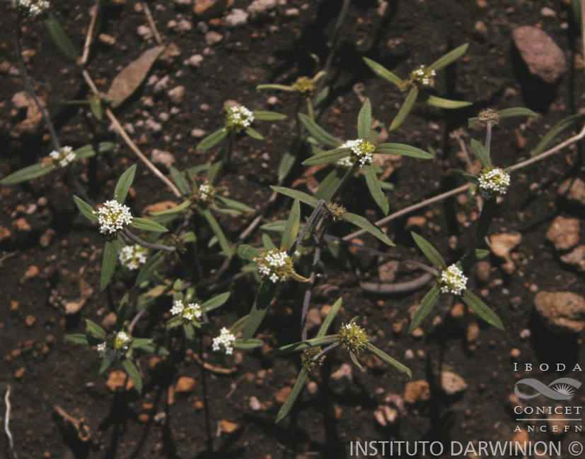 Hierba de 15-50(-70) cm de alto, erecta o decumbente; tallos simples o ramificados, cilíndricos o 4-gonos en los entrenudos apicales, pubescentes, fistulosos. Hojas sésiles; láminas elípticas, de 2,6-30 × 0,5-12,2 mm, ápice agudo, base atenuada en un pseudopecíolo corto, borde revoluto, escábridas, vilosas o glabrescentes; estípula de 2-3 mm de largo, pubescente, con 5-9(-11) fimbrias, pubescentes. Inflorescencias en glomérulos de 5-15 mm de diámetro, terminales y axilares, numerosos; brácteas 2-4. Flores con hipanto pubescente; cáliz 4-lobado, lóbulos mayores de 1,5-2 mm de largo, ciliados, los menores triangular-subulados, de 1-1,2 mm de largo; corola blanca, de 2-2,5(-5) mm de largo, externamente papilosa e internamente con un anillo de pelos ralos en la mitad inferior; estambres subsésiles, anteras apiculadas, de 0,4-0,5 mm de largo; estilo de 1,5-2,2 mm de largo, ramas estigmáticas de 0,3-0,5 mm de largo; disco entero. Fruto una cápsula subglobosa o subelipsoide, de 2-2,3 mm de largo, pubescente en la mitad superior, mitad inferior persistente, glabra o glabrescente. Semillas subelipsoides, de 0,6-10 mm de largo, retículo-foveadas, con fosita ventral + cruciforme, cubierta por el estrofíolo persistente.