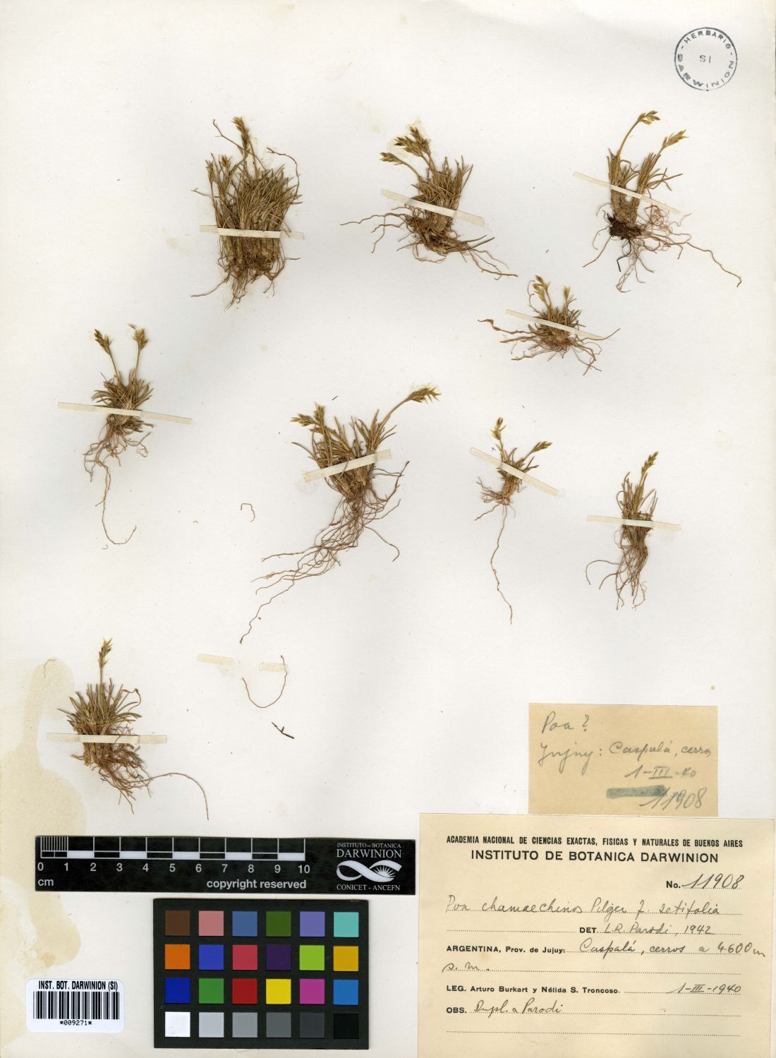 Observaciones: Hasta el momento sólo se conoce la forma pistilada y pareciera que no existen contrapartes estaminadas. A pesar de ello, se observaron cariopsis bien desarrolladas, lo que indicaría un comportamiento apomíctico. Poa chamaeclinos es extremadamente afín a P. perligulata no pudiéndose establecer de manera clara las discontinuidades entre estas dos especies.