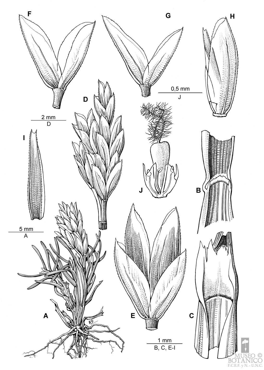 A, hábito; B, lígula truncada breve; C, lígula truncada larga; D, detalle de la panoja; E, espiguilla; F-G, glumas, muestran diferente forma y número de nervios en la gluma inferior; H, antecio; I, pálea; J, detalle de flor pistilada con estaminodios diminutos y lodículas.