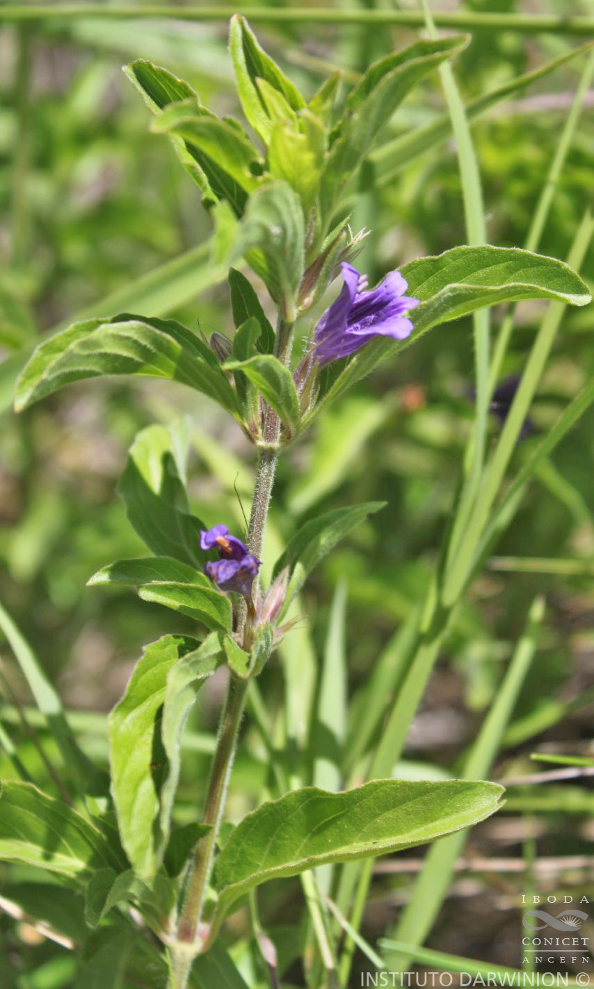 Hierbas sufruticosas, con tallos robustos, erectos, apoyantes o decumbentes de 50-90 cm de largo, 4-gonos, densa y cortamente pubescentes a hirsutos cuando jóvenes. Hojas cortamente pecioladas con lámina anchamente ovada o elíptica, de 3-7 × 1,3-3 cm, algo decurrente en la base, obtusa a redondeada en el ápice, levemente pubérula a densamente pubescente cuando joven, glabrescente a la madurez, con el margen algo sinuoso o crenulado; hojas basales generalmente menores y obovadas a orbiculares. Flores sésiles, dispuestas en fascículos multifloros, violáceas, de 1,5-2,7 cm de largo, exteriormente pubérulas, con tubo basal de 0,7-0,9 cm de largo, ensanchado en una garganta hasta de 0,5 × 0,4 cm, con el limbo bilabiado; labio posterior 2-lobado, el anterior patente y profundamente 3-lobado, ambos de 0,5-0,8 cm de largo; anteras inclusas ca. 1,5 mm de largo, calcaradas; filamentos ca. 5 mm de largo. Cápsulas angostamente claviformes, ca. 12 × 3-4 mm, huecas casi hasta la base, con retináculos pequeños. Semillas ca. 2 mm de diámetro, pubescentes.