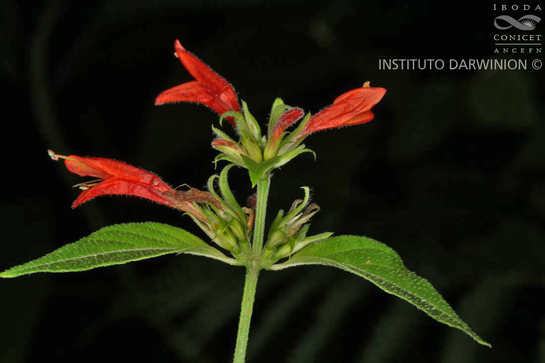 Hierbas perennes, rizomatosas en la base, con tallos erectos de 0,40-1 m de alto, a veces algo apoyantes, cilíndrico-hexagonales, densamente ramificados y hojosos, glabros a levemente pilosos o seríceos. Hojas con pecíolo de 1-3 cm de largo y lámina ovada a elíptica de 5-10 × 2-4 cm (las apicales menores y más cortamente pecioladas), cuneada en la base, acuminada en el ápice, glabra a adpreso-pilosa o levemente serícea, sobre todo en la nervadura. Inflorescencias condensadas en la porción superior de los tallos, en las axilas de las hojas superiores, formadas por 3-5 espiguillas sésiles agrupadas en un solo plano en una seudoumbela flabeliforme, también sésil, con un par de brácteas basales, lanceoladas, de 6-8 mm de largo; frecuentemente seudoumbelas adicionales derivadas de yemas supernumerarias entre ésta y la hoja axilante, formando todo el conjunto un fascículo axilar denso de brácteas y flores; brácteas involucrales desiguales, la posterior oblongo-lanceolada, de 0,8-1 cm × 1,5 mm, foliosa en el ápice, la anterior lanceolada, más corta, de 6-8 × 1, 5 mm, ambas agudas, blanquecinas o moradas, pálidas y escariosas en la base y levemente pilosas a glabras hacia el ápice; brácteas y bractéolas internas angostamente elípticas, hasta de 6 mm de largo, membranáceo- escariosas. Flores que se desarrollan 1 por espiguilla; cáliz ca. 5 mm de largo con los segmentos lanceolados de 3-4 mm de largo, hialinos y agudos, generalmente glabros; corola de 2,5-3 cm de largo, roja (excepcionalmente amarilla), con el tubo de 1,5-2 cm de largo × 4-5 mm de diámetro en la fauce y labios de 0,8-1 cm de largo, el posterior redondeado y levemente emarginado, el anterior cortamente 3-lobado; estambres con filamentos ca. 1,5 cm de largo y anteras con tecas a distinta altura, de contorno elíptico, ca. 1,5 cm de largo, múticas; ovario y estilo glabros; disco sinuado. Cápsulas de contorno ovado, comprimidas y levemente estipitadas, de 6 mm de largo × 2-3 mm de diámetro, levemente pilosas a glabras, de paredes tenues, con las placentas que las desgarran al separarse arqueándose a la madurez. Semillas de 2,5 mm de diámetro, oscuras, algo rugosas y muy cortamente verrugoso-pilosas; retináculos ca. 0,5 mm de largo, agudos.