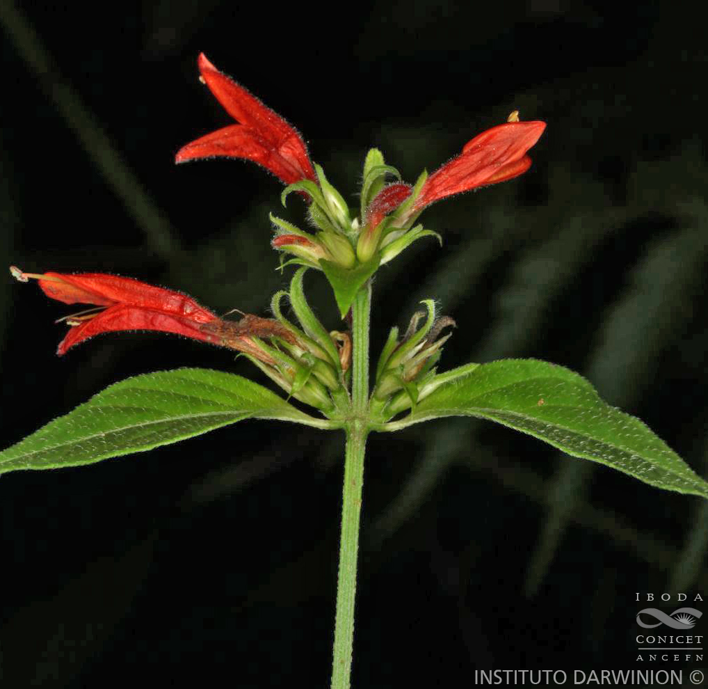 Hierbas perennes, rizomatosas en la base, con tallos erectos de 0,40-1 m de alto, a veces algo apoyantes, cilíndrico-hexagonales, densamente ramificados y hojosos, glabros a levemente pilosos o seríceos. Hojas con pecíolo de 1-3 cm de largo y lámina ovada a elíptica de 5-10 × 2-4 cm (las apicales menores y más cortamente pecioladas), cuneada en la base, acuminada en el ápice, glabra a adpreso-pilosa o levemente serícea, sobre todo en la nervadura. Inflorescencias condensadas en la porción superior de los tallos, en las axilas de las hojas superiores, formadas por 3-5 espiguillas sésiles agrupadas en un solo plano en una seudoumbela flabeliforme, también sésil, con un par de brácteas basales, lanceoladas, de 6-8 mm de largo; frecuentemente seudoumbelas adicionales derivadas de yemas supernumerarias entre ésta y la hoja axilante, formando todo el conjunto un fascículo axilar denso de brácteas y flores; brácteas involucrales desiguales, la posterior oblongo-lanceolada, de 0,8-1 cm × 1,5 mm, foliosa en el ápice, la anterior lanceolada, más corta, de 6-8 × 1, 5 mm, ambas agudas, blanquecinas o moradas, pálidas y escariosas en la base y levemente pilosas a glabras hacia el ápice; brácteas y bractéolas internas angostamente elípticas, hasta de 6 mm de largo, membranáceo- escariosas. Flores que se desarrollan 1 por espiguilla; cáliz ca. 5 mm de largo con los segmentos lanceolados de 3-4 mm de largo, hialinos y agudos, generalmente glabros; corola de 2,5-3 cm de largo, roja (excepcionalmente amarilla), con el tubo de 1,5-2 cm de largo × 4-5 mm de diámetro en la fauce y labios de 0,8-1 cm de largo, el posterior redondeado y levemente emarginado, el anterior cortamente 3-lobado; estambres con filamentos ca. 1,5 cm de largo y anteras con tecas a distinta altura, de contorno elíptico, ca. 1,5 cm de largo, múticas; ovario y estilo glabros; disco sinuado. Cápsulas de contorno ovado, comprimidas y levemente estipitadas, de 6 mm de largo × 2-3 mm de diámetro, levemente pilosas a glabras, de paredes tenues, con las placentas que las desgarran al separarse arqueándose a la madurez. Semillas de 2,5 mm de diámetro, oscuras, algo rugosas y muy cortamente verrugoso-pilosas; retináculos ca. 0,5 mm de largo, agudos.