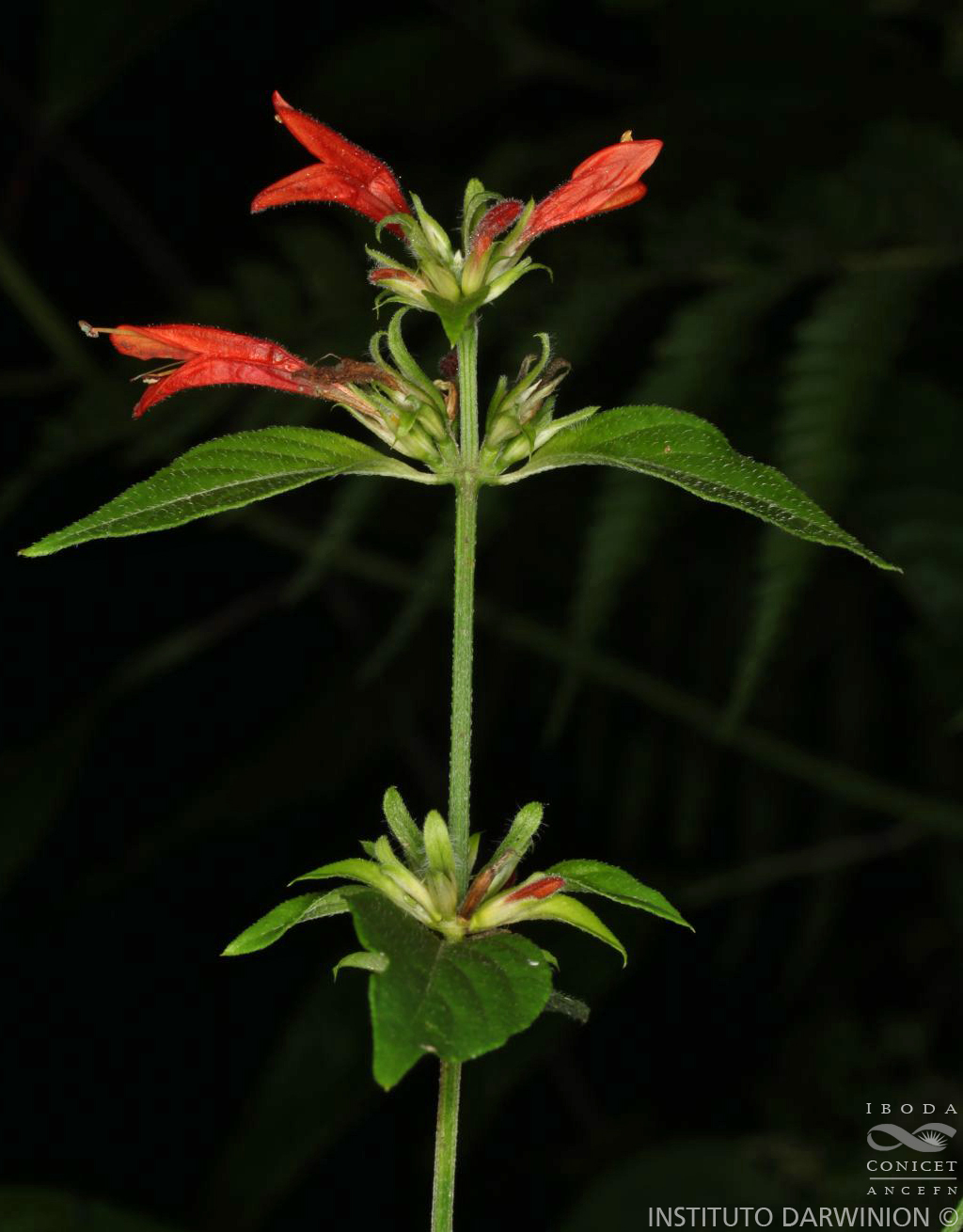 Hierbas perennes, rizomatosas en la base, con tallos erectos de 0,40-1 m de alto, a veces algo apoyantes, cilíndrico-hexagonales, densamente ramificados y hojosos, glabros a levemente pilosos o seríceos. Hojas con pecíolo de 1-3 cm de largo y lámina ovada a elíptica de 5-10 × 2-4 cm (las apicales menores y más cortamente pecioladas), cuneada en la base, acuminada en el ápice, glabra a adpreso-pilosa o levemente serícea, sobre todo en la nervadura. Inflorescencias condensadas en la porción superior de los tallos, en las axilas de las hojas superiores, formadas por 3-5 espiguillas sésiles agrupadas en un solo plano en una seudoumbela flabeliforme, también sésil, con un par de brácteas basales, lanceoladas, de 6-8 mm de largo; frecuentemente seudoumbelas adicionales derivadas de yemas supernumerarias entre ésta y la hoja axilante, formando todo el conjunto un fascículo axilar denso de brácteas y flores; brácteas involucrales desiguales, la posterior oblongo-lanceolada, de 0,8-1 cm × 1,5 mm, foliosa en el ápice, la anterior lanceolada, más corta, de 6-8 × 1, 5 mm, ambas agudas, blanquecinas o moradas, pálidas y escariosas en la base y levemente pilosas a glabras hacia el ápice; brácteas y bractéolas internas angostamente elípticas, hasta de 6 mm de largo, membranáceo- escariosas. Flores que se desarrollan 1 por espiguilla; cáliz ca. 5 mm de largo con los segmentos lanceolados de 3-4 mm de largo, hialinos y agudos, generalmente glabros; corola de 2,5-3 cm de largo, roja (excepcionalmente amarilla), con el tubo de 1,5-2 cm de largo × 4-5 mm de diámetro en la fauce y labios de 0,8-1 cm de largo, el posterior redondeado y levemente emarginado, el anterior cortamente 3-lobado; estambres con filamentos ca. 1,5 cm de largo y anteras con tecas a distinta altura, de contorno elíptico, ca. 1,5 cm de largo, múticas; ovario y estilo glabros; disco sinuado. Cápsulas de contorno ovado, comprimidas y levemente estipitadas, de 6 mm de largo × 2-3 mm de diámetro, levemente pilosas a glabras, de paredes tenues, con las placentas que las desgarran al separarse arqueándose a la madurez. Semillas de 2,5 mm de diámetro, oscuras, algo rugosas y muy cortamente verrugoso-pilosas; retináculos ca. 0,5 mm de largo, agudos.