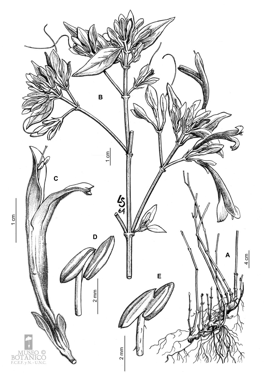 A. Planta. B. Rama. C. Flor. D-E. Antera, vista dorsal y ventral