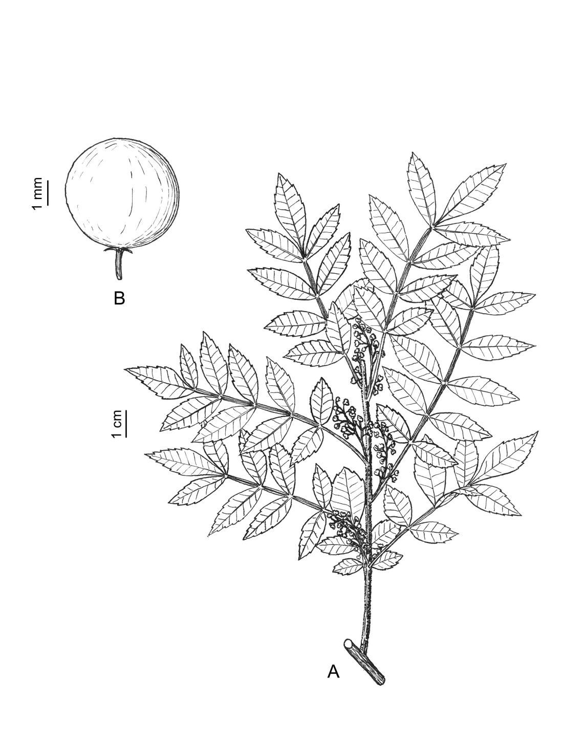Árboles ramosos, hasta de 15 m de alto, diclino-monoicos; corteza gris oscura, fisurada, agrietada y escamosa con el paso de los años; ramas inermes, pubescentes a tomentosas cuando jóvenes, glabras a la madurez. Hojas imparipinnadas; pecíolo de 1-4 cm de largo, no alado a subalado; raquis alado, en ocasiones subalado; folíolos en 2-10 pares, opuestos, sésiles; lámina elíptica a obovada, en ocasiones oblonga o lanceolada, de 1,5-6 × 0,5-3 cm, ápice agudo, acuminado o mucronulado, base cuneada a obtusa, margen revoluto, serrado, en ocasiones entero, glabra a subglabra en la cara adaxial, tomentosa en la cara abaxial con tricomas ocráceos, en ocasiones con tricomas densos concentrados sólo en las nervaduras, cartácea a subcoriácea, venación conspicua. Inflorescencias en panículas multifloras y laxas, raro en pseudoracimos, hasta de 15 cm de largo; raquis más o menos tomentoso y brácteas isomorfas. Flores 5-meras; pedicelos de 1-2 mm de largo, notoriamente articulados; cáliz con lóbulos ca. 1 mm de largo, pubérulos; pétalos oblongos, de 1,3-2,5 mm de largo, glabros o pubérulos, blancos o blancoamarillentos. Flores pistiladas con gineceo ca. 1 mm de largo. Drupa de 4-6 mm de diámetro, glabra, rojiza a purpúrea.