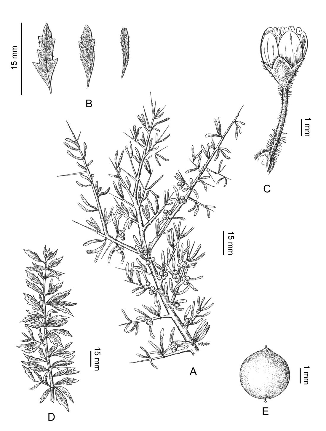 A. Aspecto de una rama fructífera. B. Variación morfológica de las hojas. C. Vista lateral de una flor estaminada. D. Rama juvenil. E. Fruto. Tomado y adaptado de Candollea 45: fig. 2. 1990.
