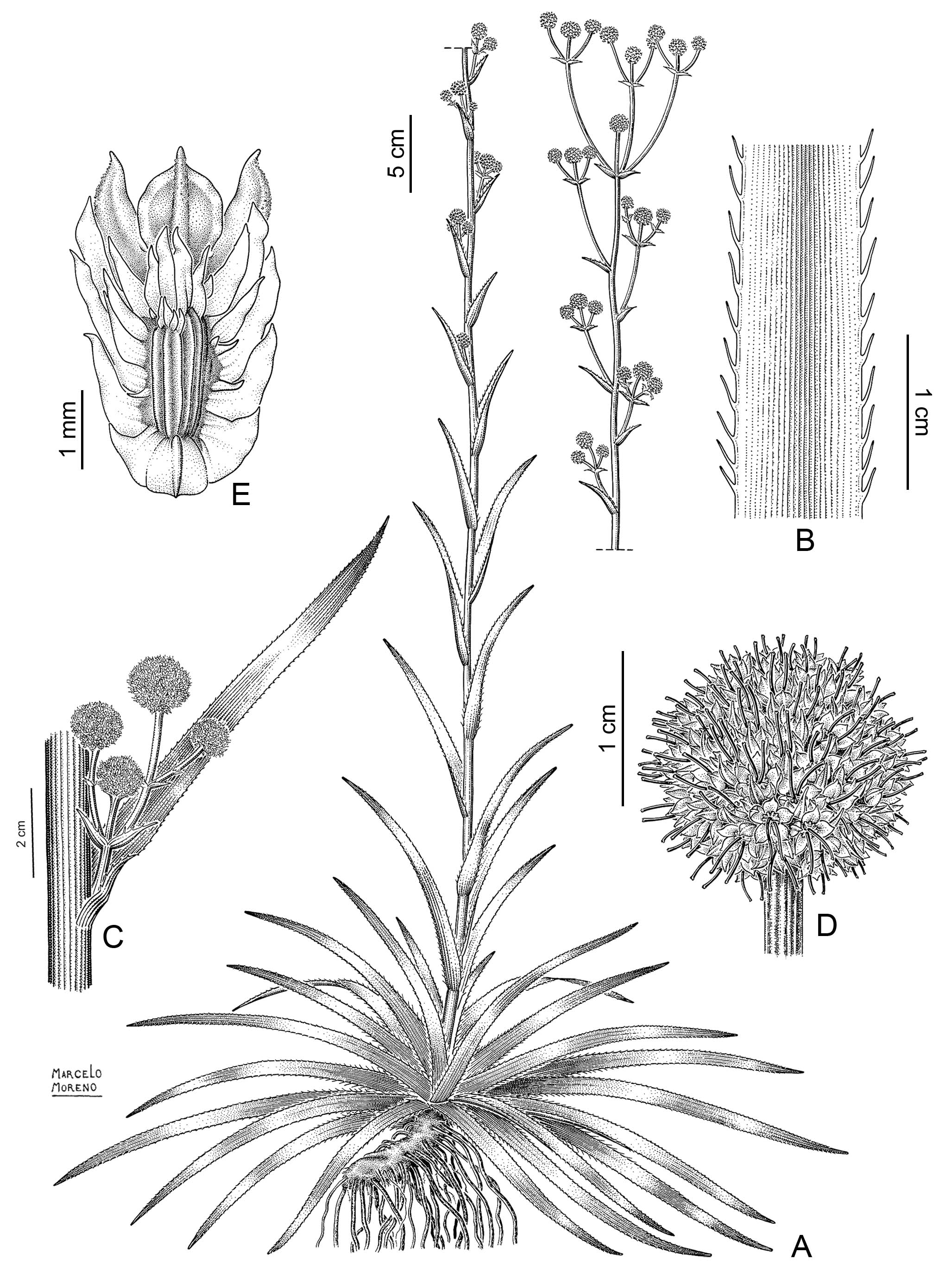 Hierbas perennes de 0,5-1,5 m de alto; raíces fasciculadas a partir de un rizoma grueso, oblicuo u horizontal. Tallo primario erecto, más o menos robusto, con pleocasio terminal 3-4 radiado de cimas 2-3 divididas, y algunas cimas laterales reducidas, hasta monocéfalas por debajo. Hojas basales tendidas hasta erectas, coriáceas, sésiles; láminas subuladas, de 10-30 × 0,5-2 cm, ápice agudo, margen finamente espinoso-serrado, espinas de 1-3 mm de largo, vaina algo dilatada; venación paralela; hojas caulinares numerosas, semejantes a las basales aunque progresivamente menores, de 1-10 cm de largo, semiamplexicaules, más o menos ascendentes. Capítulos blancos o blanco-verdosos, hemisféricos a globosos, de 8-12 mm de diámetro; involucro inconspicuo, brácteas involucrales 8-12, angostamente ovadas, de 4-6 mm de largo, enteras o a veces con 1 o 2 dientes; brácteas florales semejantes, enteras, más largas que los frutos. Flores blancas. Frutos de 2-3 × 2-2,5 mm, mericarpios con escamas laterales y calicinales aplanadas, aliformes, dorso desnudo.