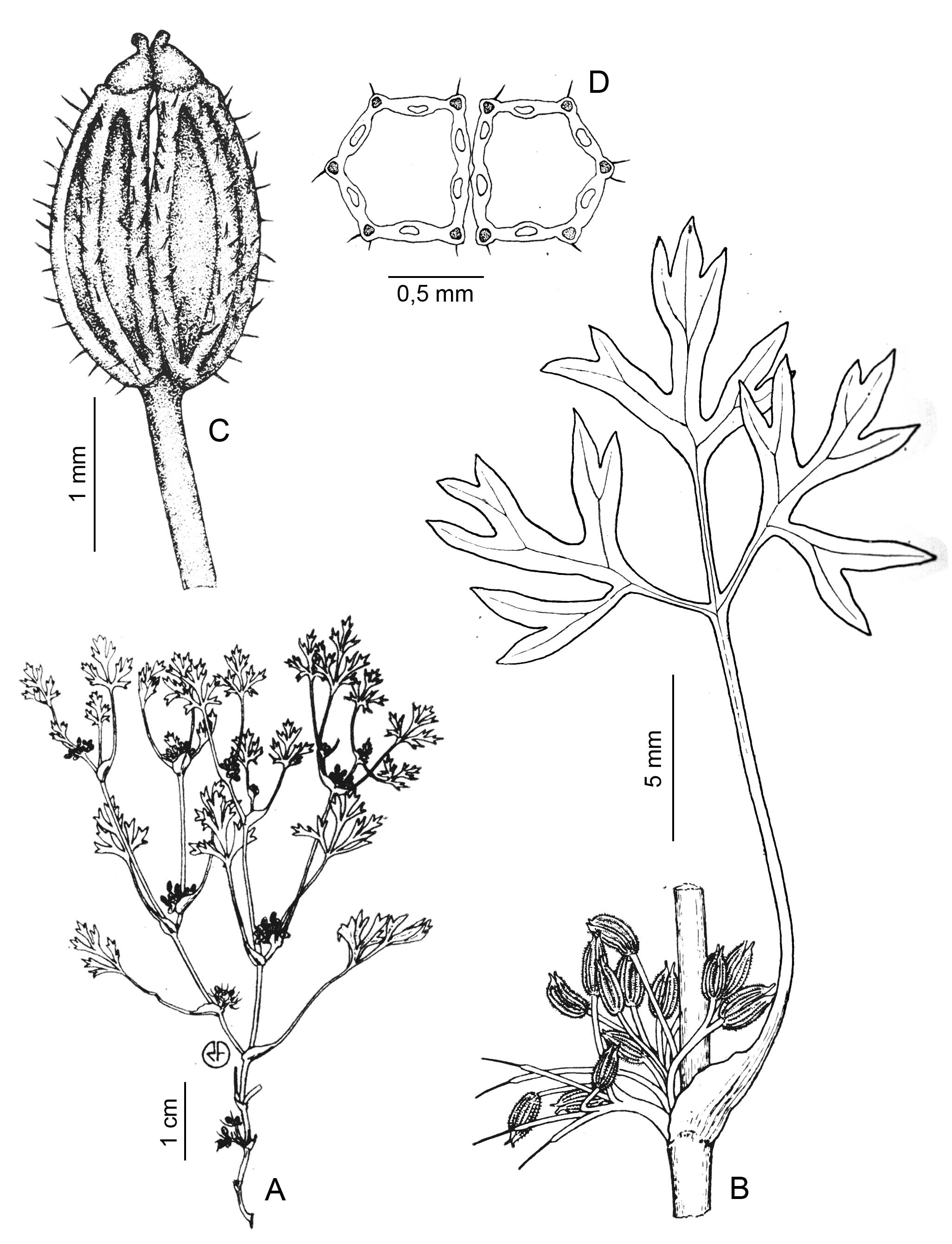 A. Planta. B. Hoja caulinar y umbela opuesta. C-D. Fruto, vista lateral y corte transversal respectivamente. Tomado de Bull. Torrey Bot. Club. 89: 366. 1962.