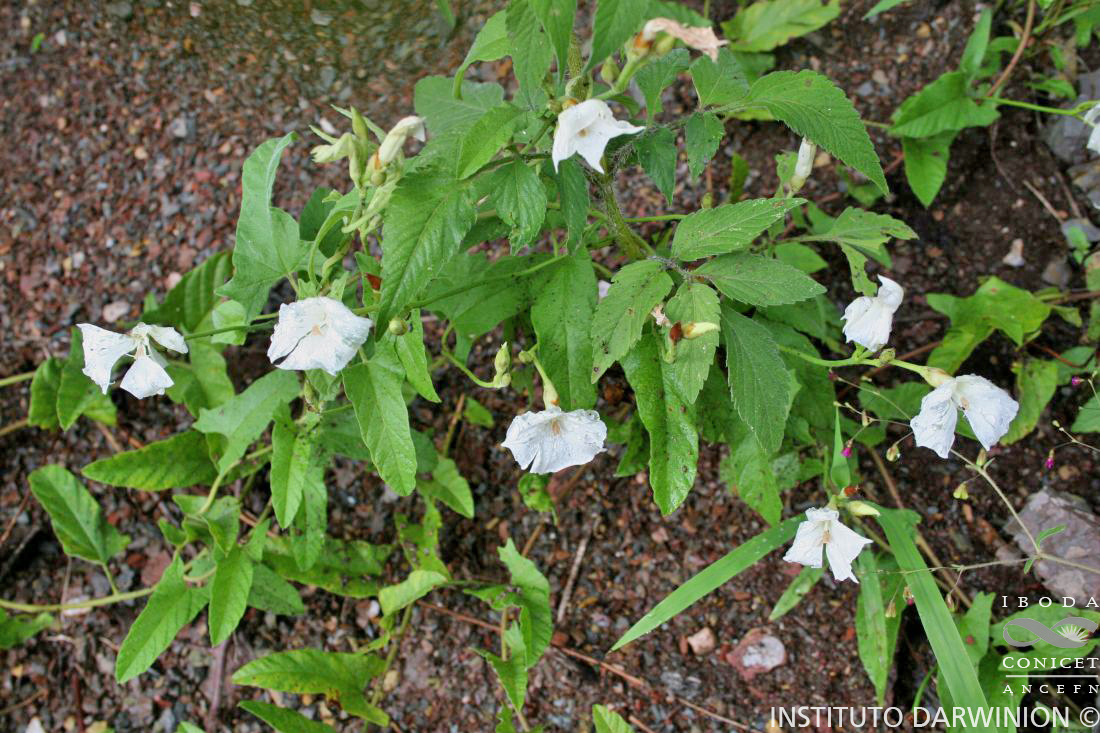 Perenne, voluble o decumbente. Raíz axonomorfa; tallos, pedúnculos y pecíolos laxa a densamente pubescentes; pelos cortos, comúnmente retrorsos. Hojas enteras, de 1,1-10 x 0,6-5 cm, ovadas, anchamente elípticas a lanceoladas, hastadas o sagitadas, de base cordada y ápice obtuso a agudo, mucronado; borde ondulado, crenado o irregularmente dentado, dientes agudos, más raro láminas lobadas; aurículas convergentes o paralelas, angulosas o 2-3-dentadas, a veces redondeadas; pubescencia densa a esparcida en ambas caras, de pelos más o menos adpresos, patentes sobre los nervios del envés. Flores pedunculadas, solitarias o en cimas 2-5-floras, a veces umbeliformes. Brácteas y bractéolas florales lanceoladas de hasta 4,5 mm. Sépalos externos elípticos a obovados, de ápice obtuso a trunco, a veces emarginado o agudo, mucronados, de 6,5-10 x 4-6 mm, pubescentes en toda su superficie o sólo en la línea media, bordes ciliados; sépalos internos elípticos u obovados, de 7-10 x 6-7,5 mm, obtusos a agudos, ciliados, mucronados, glabros o pubescentes en la línea media, márgenes hialinos; corola blanca o blanco-crema, campanulado-infundibuliforme, de 1,5-2,5 x 2 cm, con áreas mesopétalas pubescentes en la mitad superior, prolongadas en un mucrón piloso en el limbo, éste levemente 5-angulado; estambres de ± 1 cm; estilo de 1-1,4 cm; ovario glabro; estigmas cilíndricos, a veces con pelos caedizos en la base. Cápsula apiculada, castaño claro, glabra, de 8-9 mm de diám; semillas negras, de 3-5 mm, diminutamente tuberculadas o lisas. Se distingue de la subsp. montevidensis por sus cimas siempre con más de 3 flores, pedicelos relativamente cortos y formando umbelas apretadas, corolas pequeñas y generalmente rosadas.