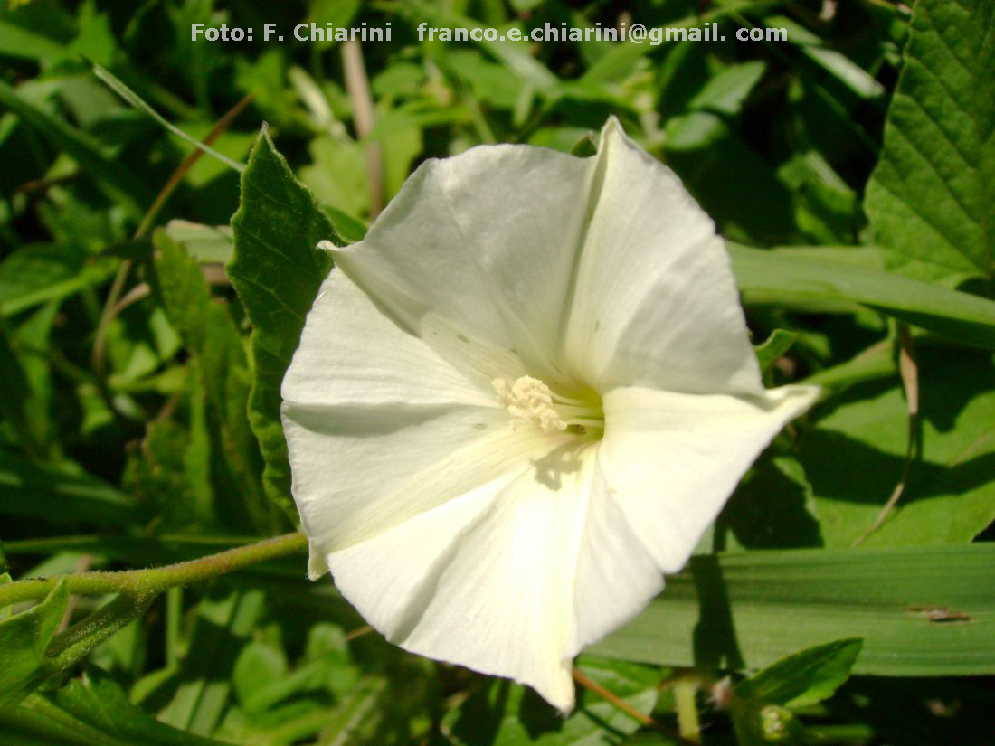 Perenne, voluble o decumbente. Raíz axonomorfa; tallos, pedúnculos y pecíolos laxa a densamente pubescentes; pelos cortos, comúnmente retrorsos. Hojas enteras, de 1,1-10 x 0,6-5 cm, ovadas, anchamente elípticas a lanceoladas, hastadas o sagitadas, de base cordada y ápice obtuso a agudo, mucronado; borde ondulado, crenado o irregularmente dentado, dientes agudos, más raro láminas lobadas; aurículas convergentes o paralelas, angulosas o 2-3-dentadas, a veces redondeadas; pubescencia densa a esparcida en ambas caras, de pelos más o menos adpresos, patentes sobre los nervios del envés. Flores pedunculadas, solitarias o en cimas 2-5-floras, a veces umbeliformes. Brácteas y bractéolas florales lanceoladas de hasta 4,5 mm. Sépalos externos elípticos a obovados, de ápice obtuso a trunco, a veces emarginado o agudo, mucronados, de 6,5-10 x 4-6 mm, pubescentes en toda su superficie o sólo en la línea media, bordes ciliados; sépalos internos elípticos u obovados, de 7-10 x 6-7,5 mm, obtusos a agudos, ciliados, mucronados, glabros o pubescentes en la línea media, márgenes hialinos; corola blanca o blanco-crema, campanulado-infundibuliforme, de 1,5-2,5 x 2 cm, con áreas mesopétalas pubescentes en la mitad superior, prolongadas en un mucrón piloso en el limbo, éste levemente 5-angulado; estambres de ± 1 cm; estilo de 1-1,4 cm; ovario glabro; estigmas cilíndricos, a veces con pelos caedizos en la base. Cápsula apiculada, castaño claro, glabra, de 8-9 mm de diám; semillas negras, de 3-5 mm, diminutamente tuberculadas o lisas. Se distingue de la subsp. montevidensis por sus cimas siempre con más de 3 flores, pedicelos relativamente cortos y formando umbelas apretadas, corolas pequeñas y generalmente rosadas.