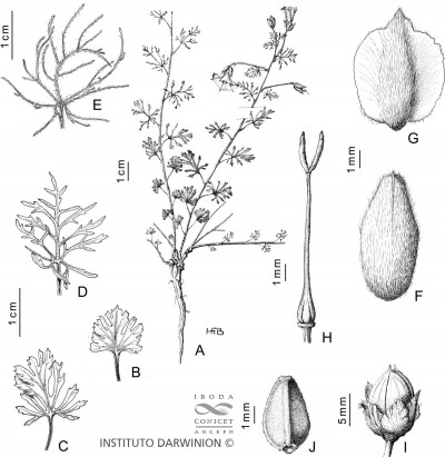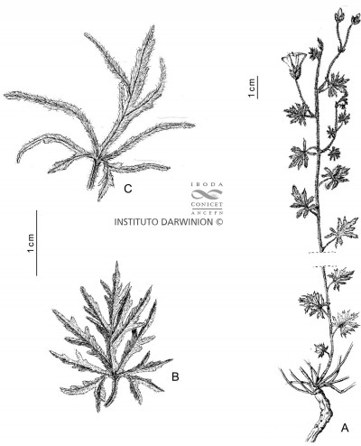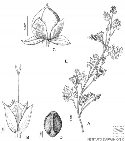 Plantas decumbentes, a veces con ápices volubles; raíz vertical, gruesa; tallos estriados o angulosos, glabros, pubescentes, con pelos simples hirsutos o densamente tomentosos. Hojas pecioladas de contorno ovado, elíptico o suborbicular, de 1-3(-5) × 1-3(-5) cm, irregularmente laciniadas, bipinnatífidas a palmati- o bipinnatisectas, las inferiores a veces sólo crenadas, ambas caras glabras hasta densamente tomentosas, base cordada. Flores solitarias o en cimas 2-floras, pedúnculos de 1-4,5 cm de largo, glabros o hirsuto-pubescentes; brácteas florales ovadas o lanceoladas, hasta de 6 mm de largo; pedicelos generalmente engrosados, glabros o pubescentes; sépalos exteriores elípticos a sub-espatulados, de 6,5-10 × 3,5-6 mm, obtusos a subagudos, mucronados, dorso glabro a pubescente, los interiores anchamente elípticos a ovados, de 6-9 × 5-6 mm, obtusos a agudos, bordes hialinos, glabros o pilosos en la línea media; corola de 1-2 cm de largo, blanca o rosada, con el tubo más oscuro, pubescente en las áreas mesopétalas; estambres ca. 10 mm de largo; gineceo con ovario glabro y estilo de 6-10 mm de largo. Cápsulas ca. 8 mm de diámetro, apiculadas, glabras. Semillas de 4-5,5 mm de largo, negras, lisas.