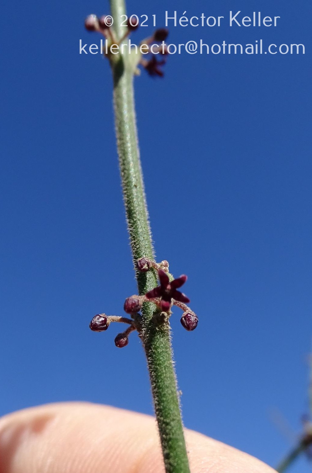 Plantas volubles de 2-6 m de alto, ramas frecuentemente áfilas, rámulos erectos o extendidos, uniformemente tomentosos. Hojas ausentes en ramas florales o muy reducidas, estrechamente lanceoladas, de 1-2 mm de largo, ápice agudo, base redondeada a cuneada, esparcidamente pilosas y ciliadas. Inflorescencias axilares, sésiles, frecuentemente opuestas, con 1-4 flores. Flores con pedicelo de 1-2,5 mm de largo, vinoso, tomentoso; cáliz con lóbulos ovados, de 0,4-0,5 × 0,4-0,6 mm, vinosos a atropurpúreos, ápice redondeado, cara abaxial pubescente, cara adaxial glabra; corola con el tubo cortamente campanulado, de 0,1-0,3 mm de largo, atropurpúreo; lóbulos lanceolados de 1,2-1,5 × 0,3-0,7 mm, glabros, atropurpúreos, patentes o recurvos, ápice agudo; corona estaminal con lóbulos semicirculares, purpúreos, de 0,1-0,2 × 0,3-0,5 mm, tan largos como el ginostegio; ginostegio sésil de 0,5-0,6 mm de alto; anteras rectangulares, de 0,4-0,5 × 0,3-0,4 mm; apéndices conectivales subcirculares a ovados, de 0,15-0,3 mm de largo; cabeza estigmática mamilada; retináculo elipsoide, ca. 0,12 × 0,04 mm, caudículas descendentes, de 0,02-0,06 mm de largo, polinios oblongo-piriformes, ca. 0,12 × 0,048 mm. Frutos y semillas no vistos.
