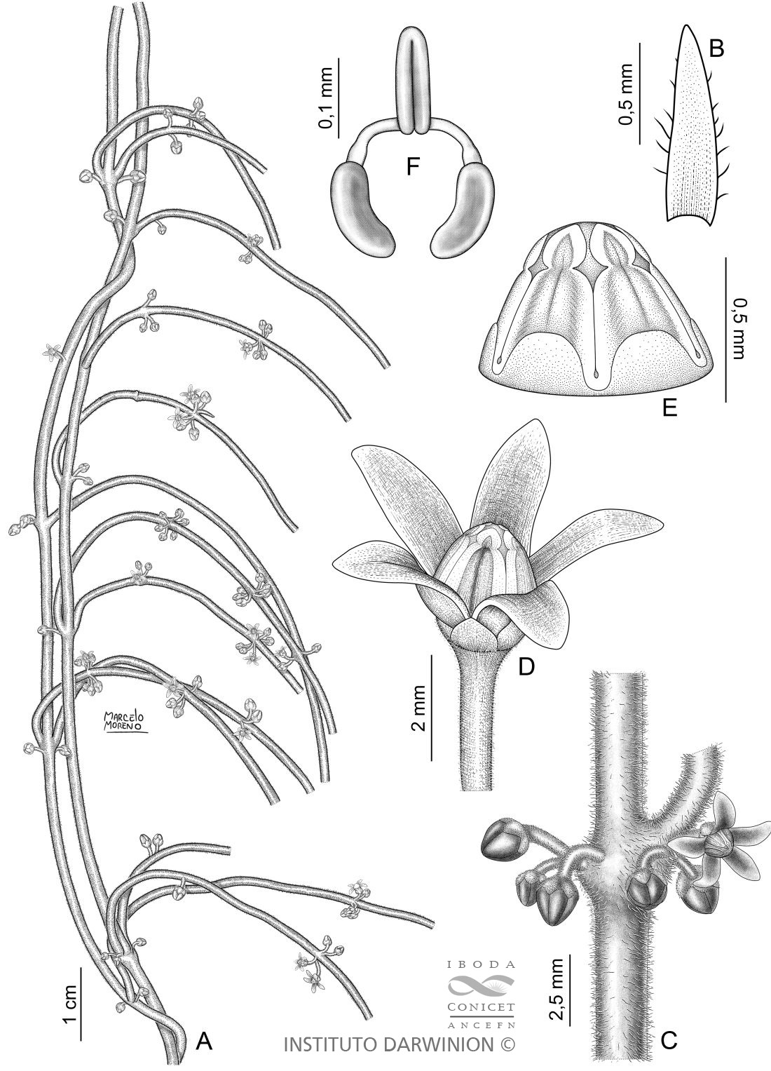 A. Ramas floríferas. B. Hoja. C. Nudo con inflorescencias. D. Flor. E. Ginostegio. F. Polinario.