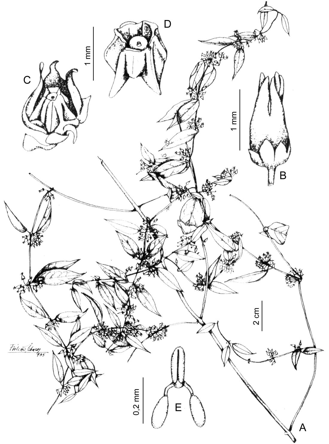 A. Ramas floríferas. B. Flor. C. Corona con lóbulo removido mostrando el ginostegio. D. Ginostegio. E. Polinario. Tomado de Fl. Il. Catarin. Apocináceas-Asclepiadóideas: 170, fig. 40. 2004.