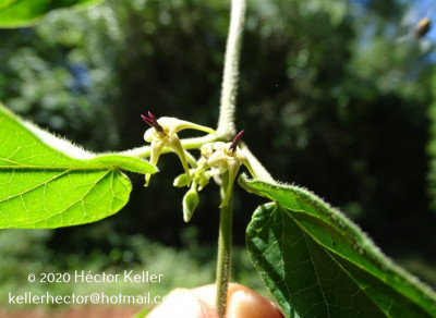 Voluble de 1,5-6 m de alto, ramas tomentosas o sublanosas. Hojas con pecíolo de 1-5 cm de largo, tomentoso; lámina ovado-triangular a oblongo-triangular, de 5-9,5 × 1,5-3,5 cm, ápice acuminado, base cordada, cara abaxial pubescente, cara adaxial pubescente a glabrescente, con 4 coléteres en la base de la vena media. Inflorescencias umbeliformes, extraaxilares, alternas, con 1-6 flores; pedúnculo de 2-10 mm de largo, pubescente. Flores con pedicelo de 0,6-1 cm de largo, tomentoso; cáliz con lóbulos linear-lanceolados, de 2,5-3 × 0,8-0,9 mm, externamente pubescentes, cara interna subglabra con 1-3 coléteres en el seno; corola con tubo campanulado de 2-2,5 mm de largo, lóbulos linear-lanceolados, de 7-15 × 1,5-2,5 mm, retorcidos, revolutos, pubescentes en ambas caras, castaña a verde-rojiza; corona con lóbulos flabeliformes, de 1,8-2 × 1-1,2 mm, con callosidad cordiforme en la cara interna, amarillenta; ginostegio sésil o subsésil, con apéndice de la cabeza estilar de 4-5,2 mm, 2-furcado desde su parte media en dos ramas agudas, divergentes, violáceos; anteras cuadrangulares, de 0,7-0,8 mm de largo, con membrana apical ovada; polinarios con el retináculo linear, de 0,48 × 0,09 mm, caudículas de 0,13-0,15 mm de largo, horizontales, dentadas, polinios de contorno oblongo, de 0,42-0,45 × 0,12-0,13 mm. Folículos ovoides, de 7-8,5 × 1,5-2 cm, generalmente simples, raro dobles, densamente corrugado-verrucosos, pubescentes. Semillas 110-150, obovadas, de 0,6-1 × 0,3-0,4 cm, verrucosas.